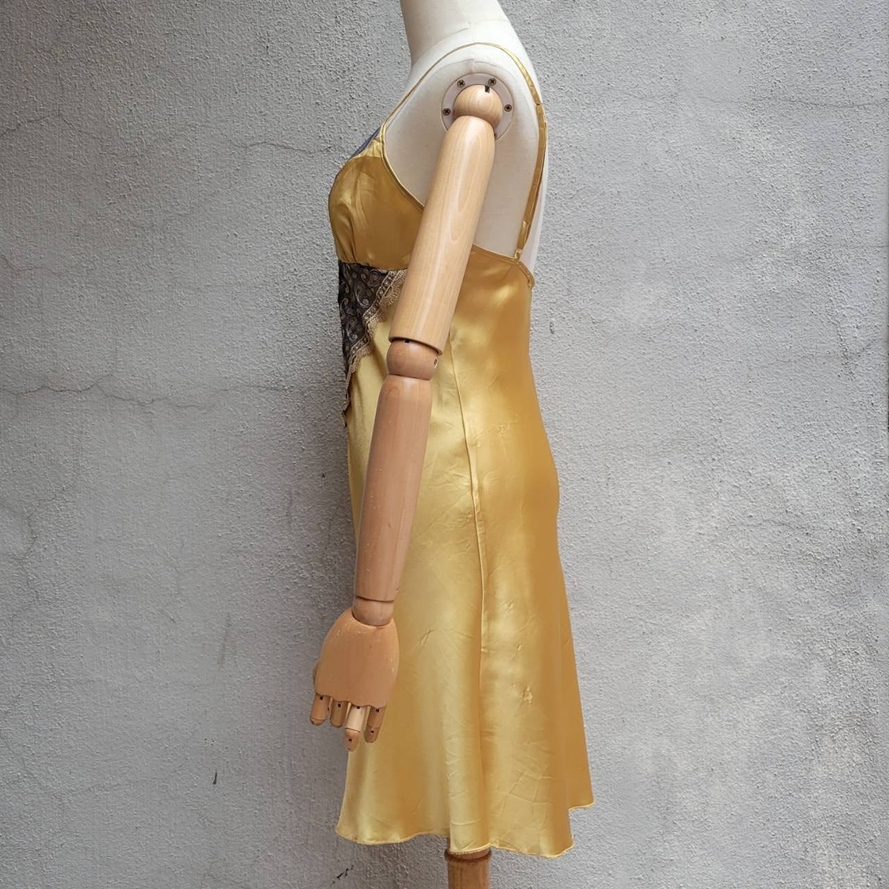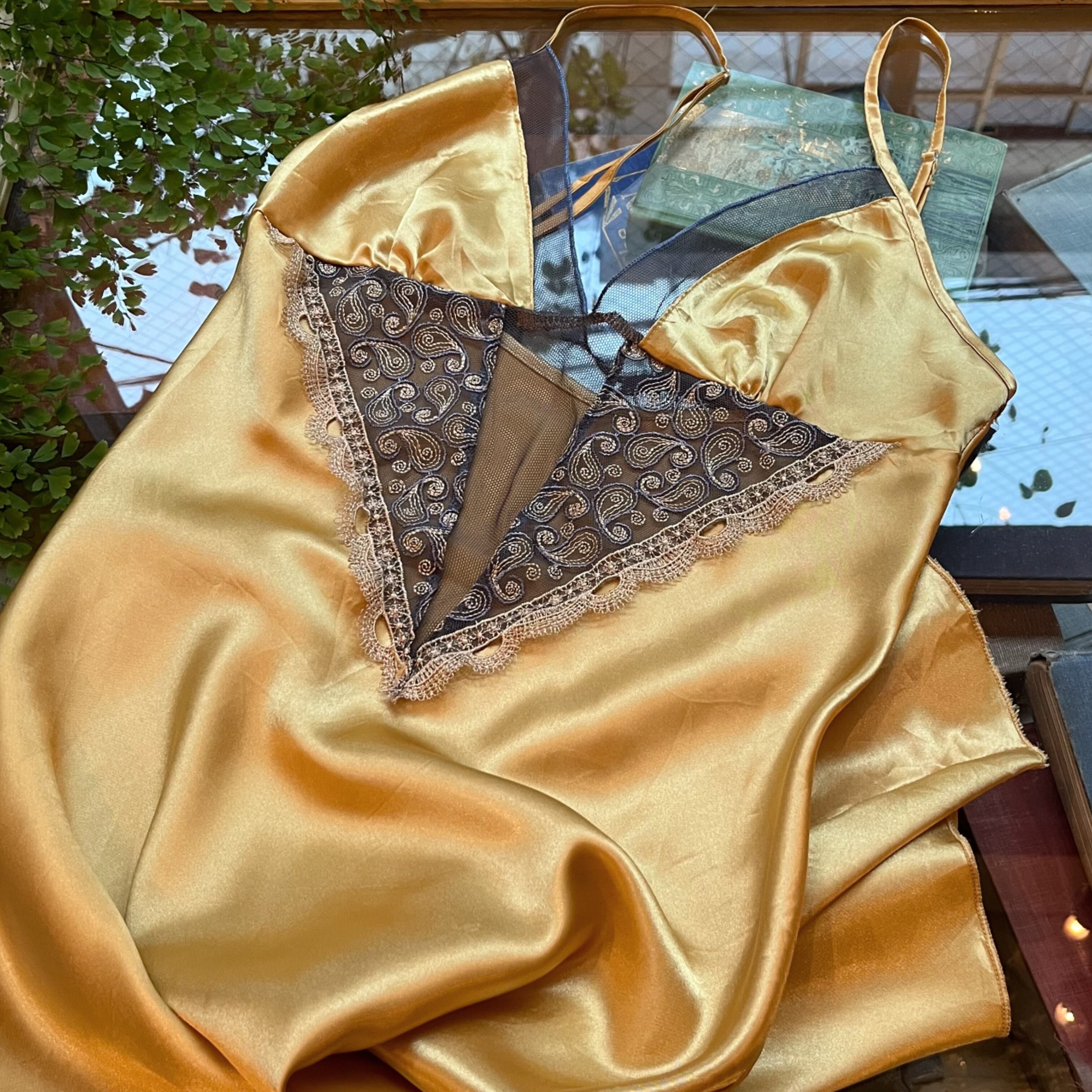 ゴールドカラーと胸元のブルーグレーレースが綺麗なサテンキャミソールドレスです