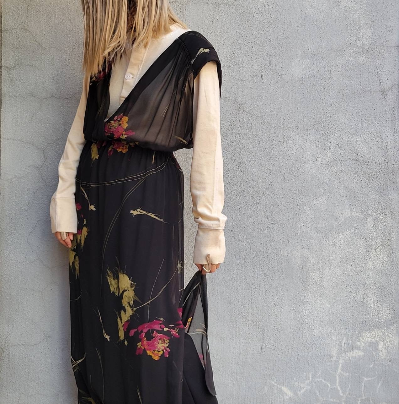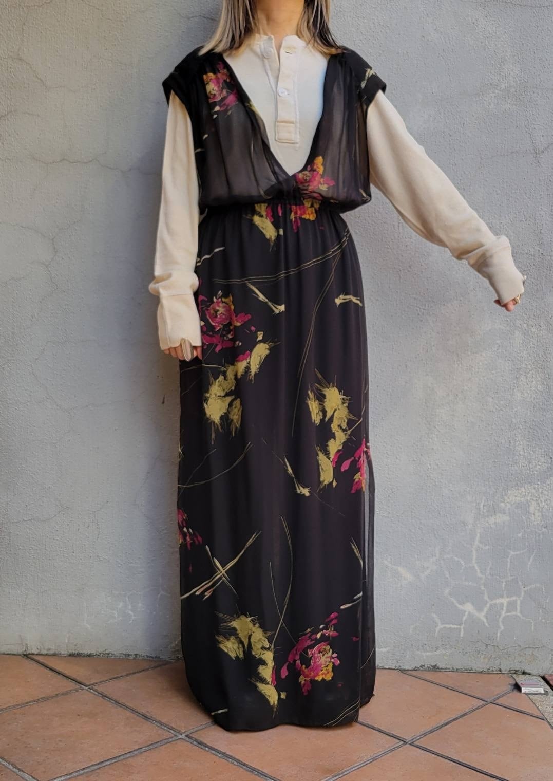 透け感のあるシフォン素材が魅力的なロングドレスです。