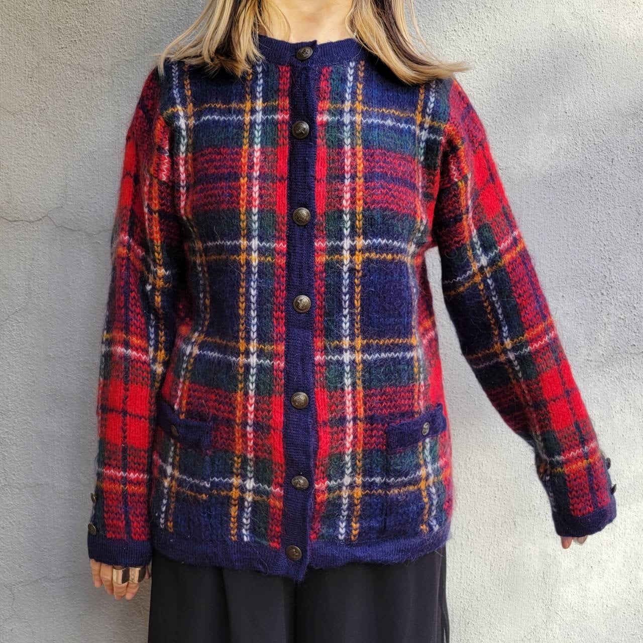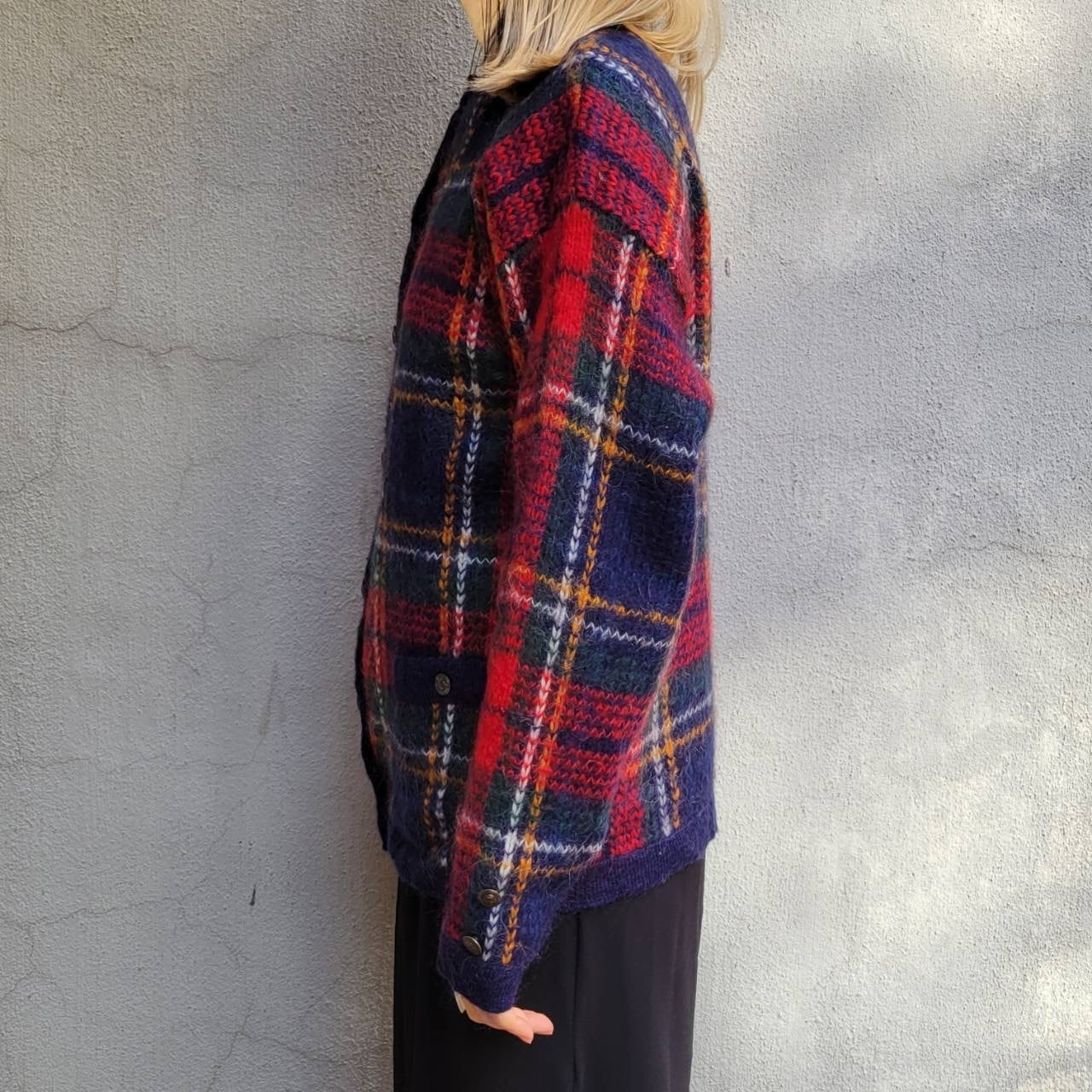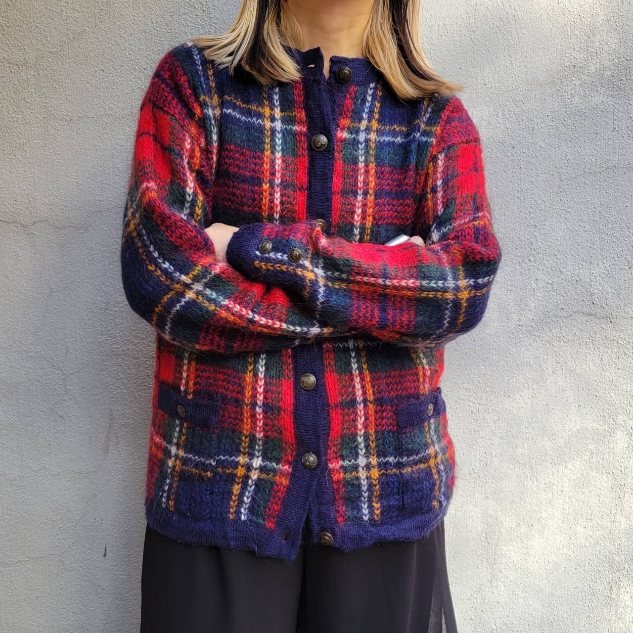 赤チェックがかわいいチェックモヘアニットカーディガンです!