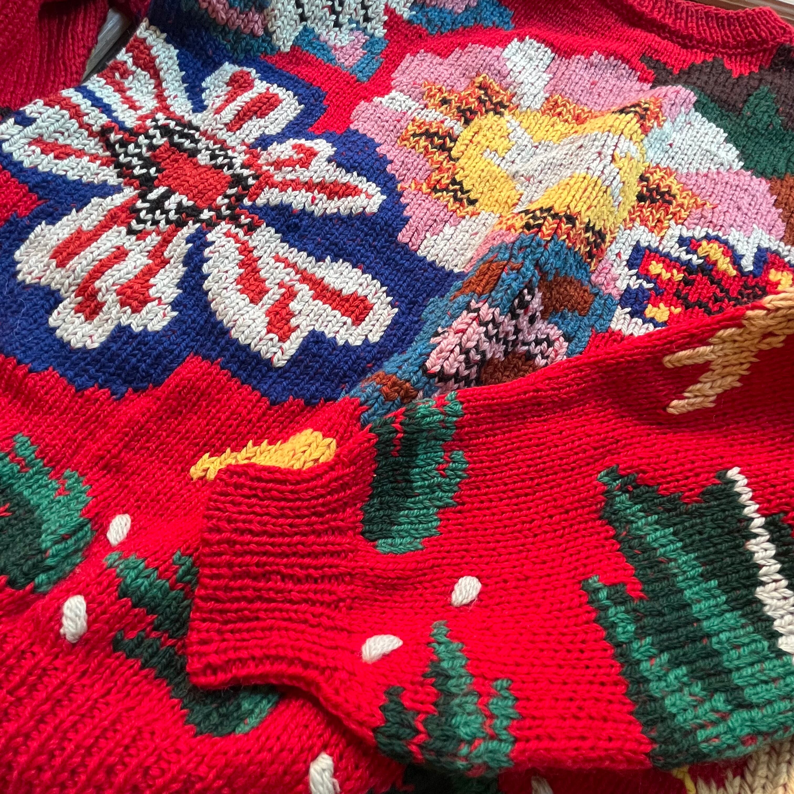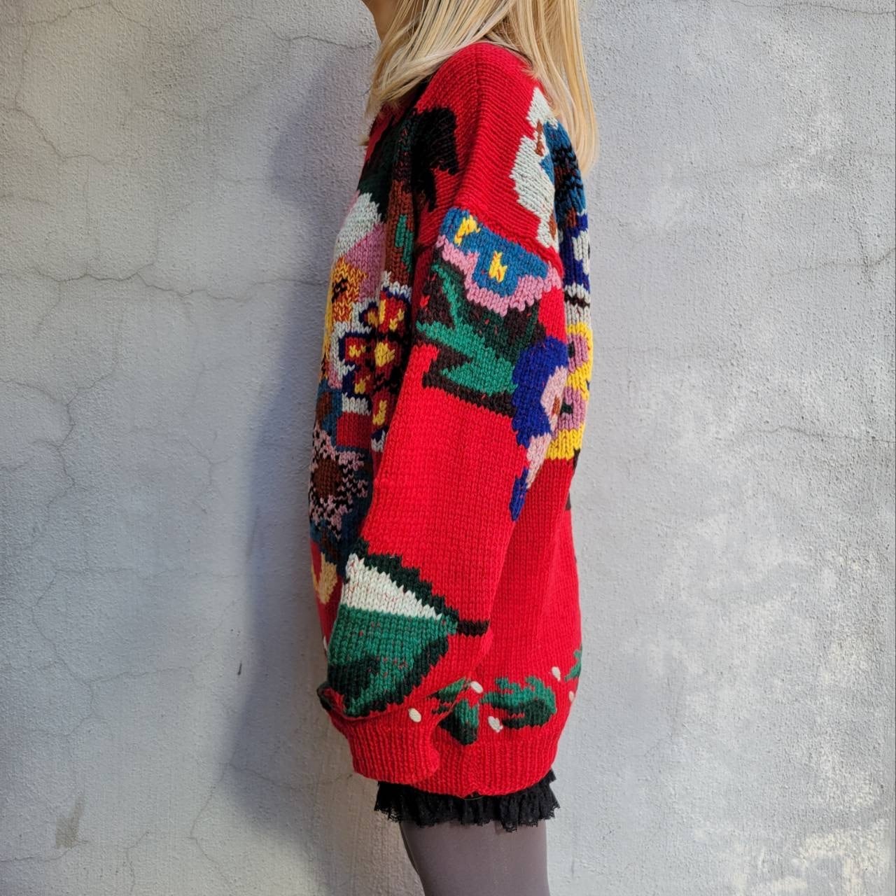 綺麗なレッドカラーに大胆なお花柄が特徴的なニットです。オーバーシルエットでリラックス感のある着こなしを楽しめる一枚です。