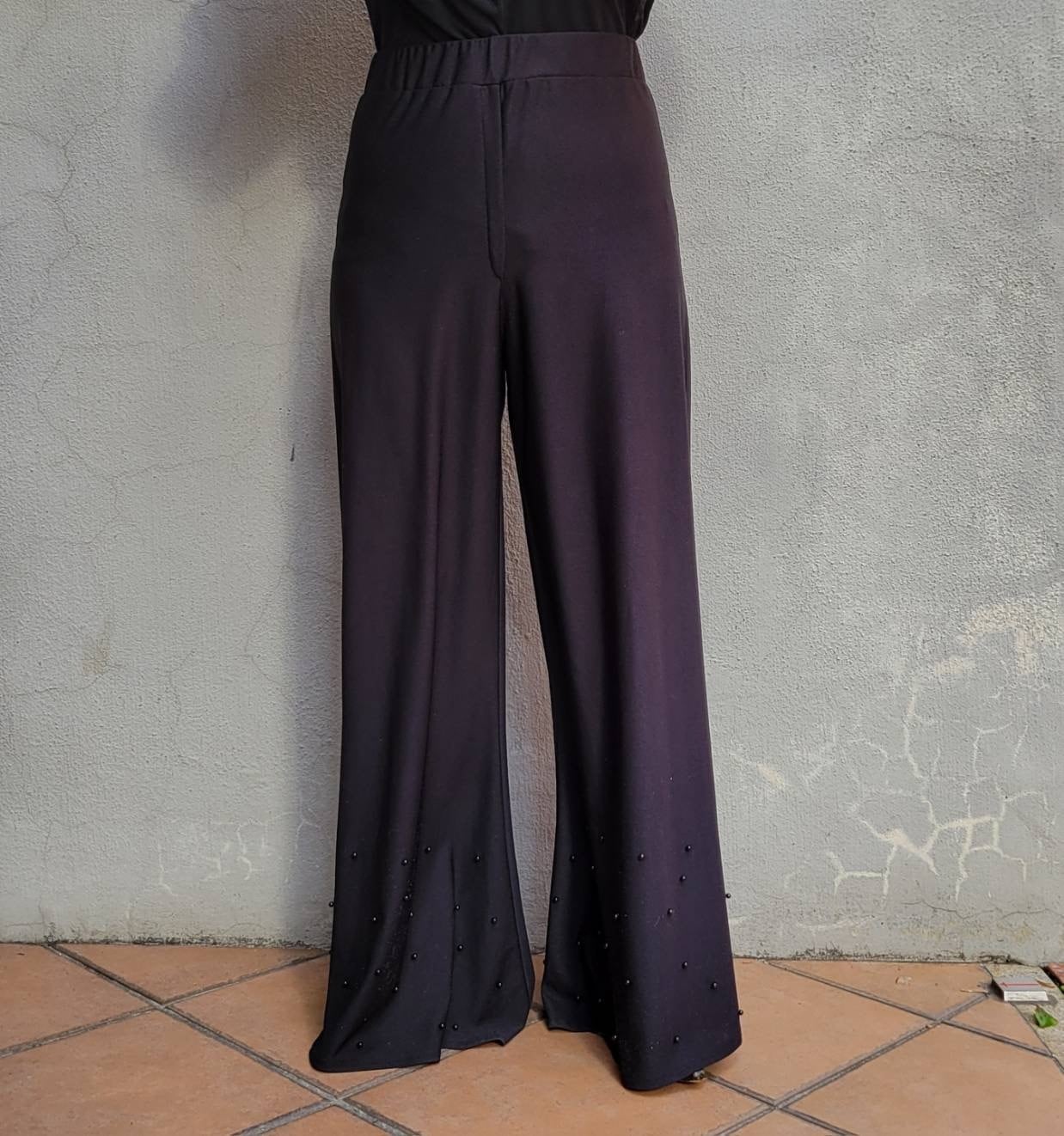 裾にむかって綺麗に広がるフレアシルエットと裾のつぶつぶがアクセントになったイージーパンツです