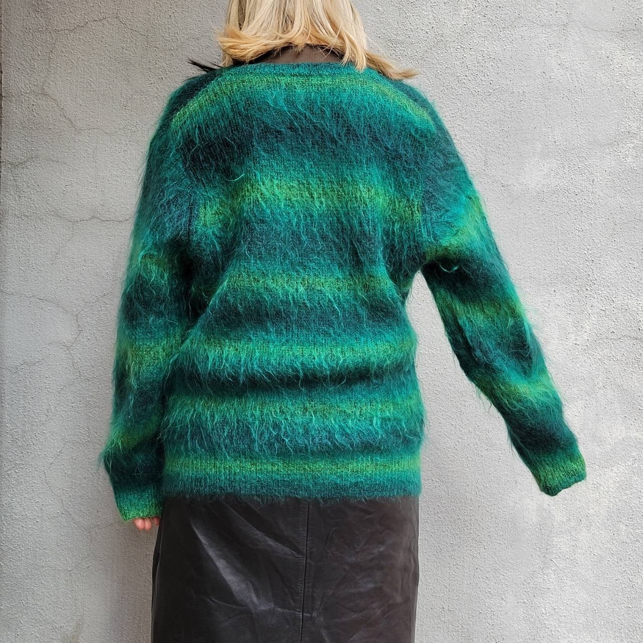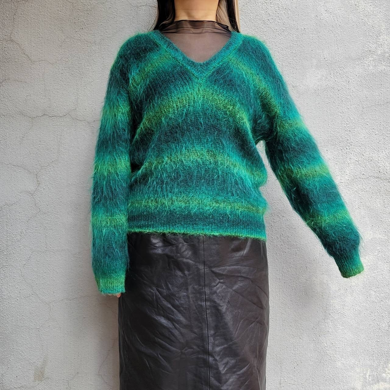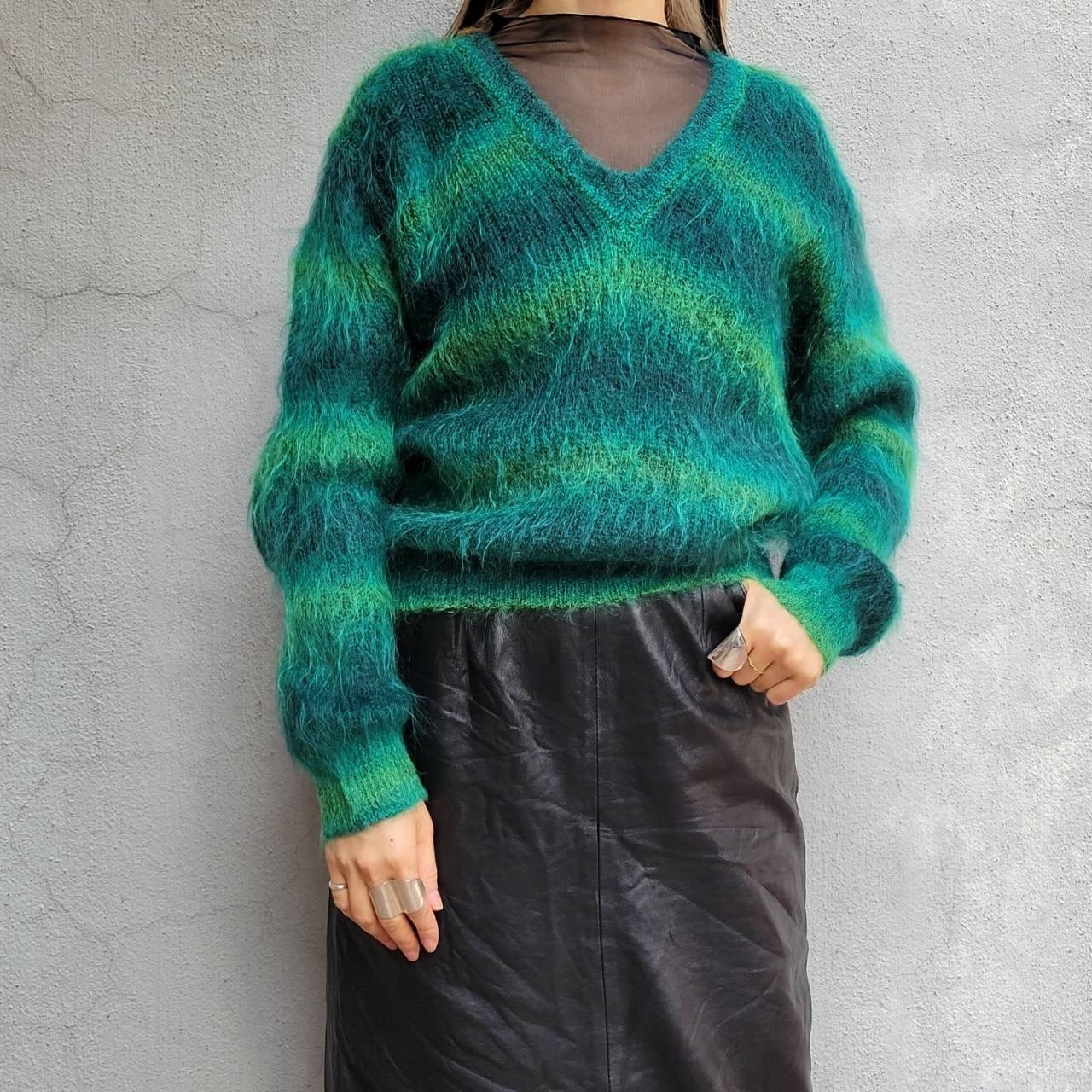 ふわふわの長い毛足がかわいい、広めのVネックデザインのモヘアニットです。