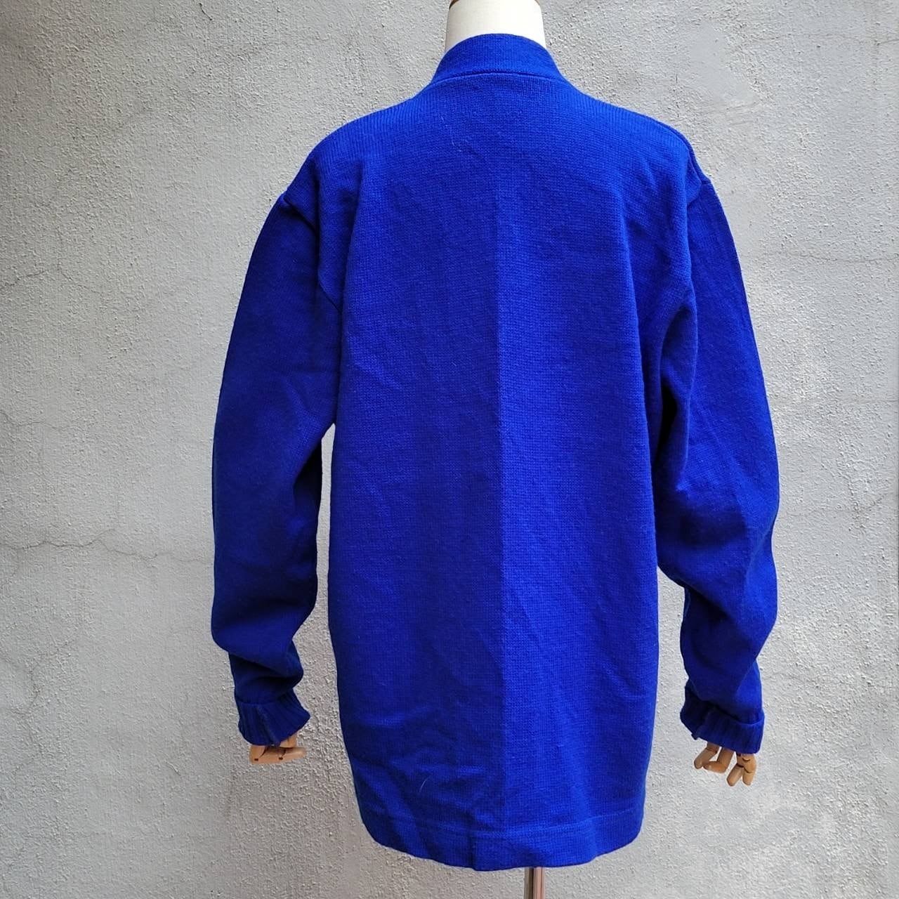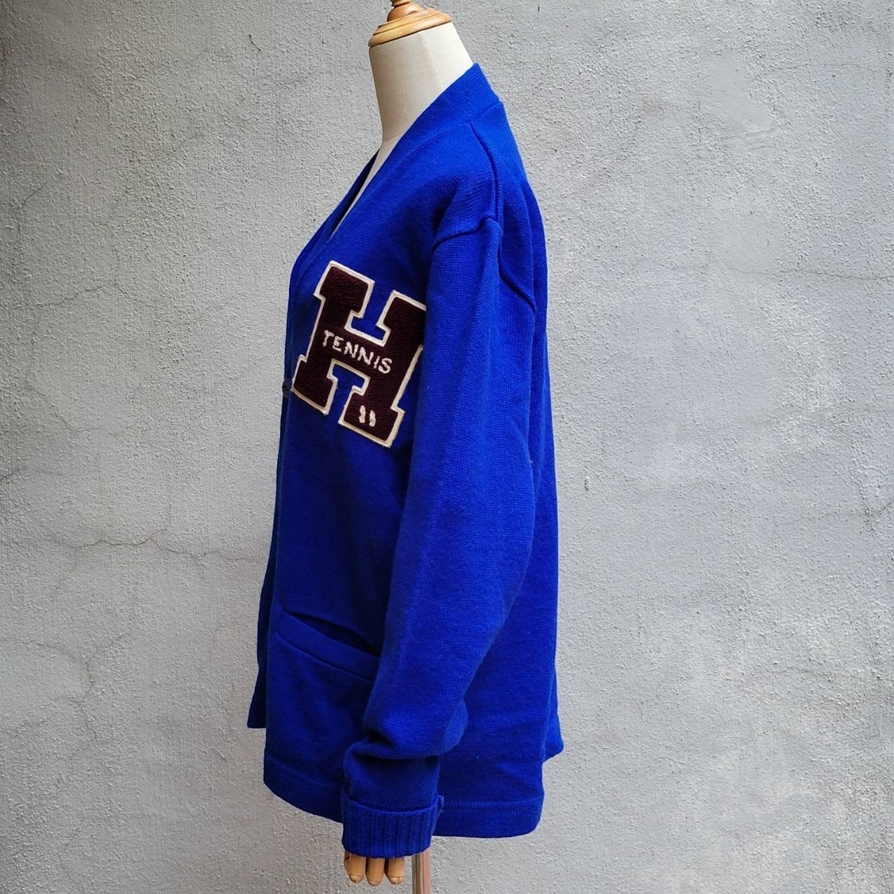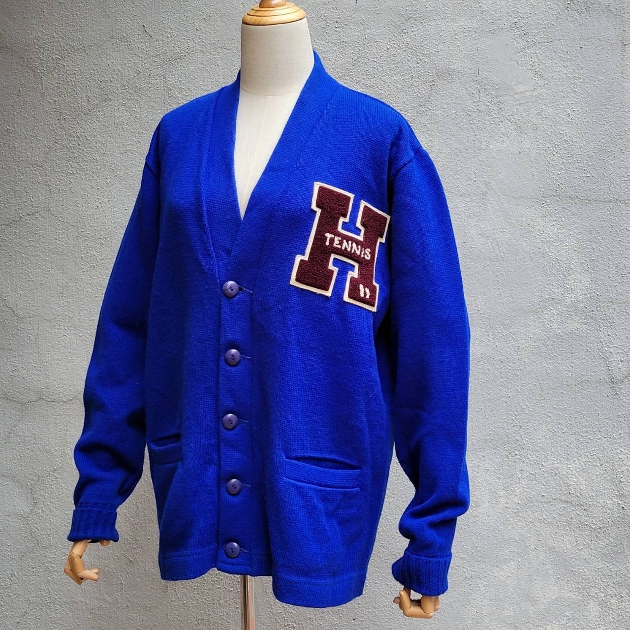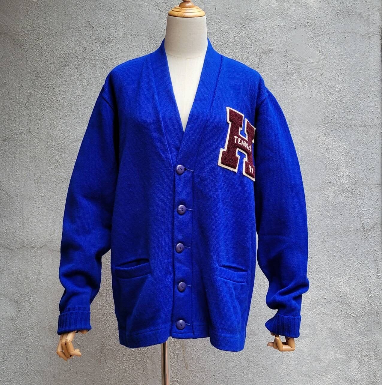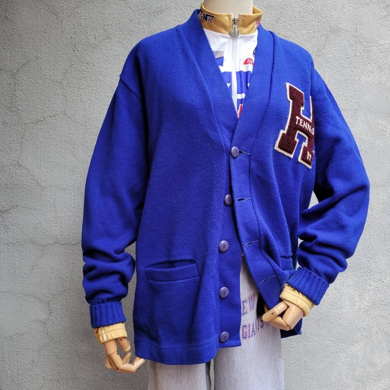 綺麗なブルーカラーと大きなワッペンが特徴的なレタードカーディガンです