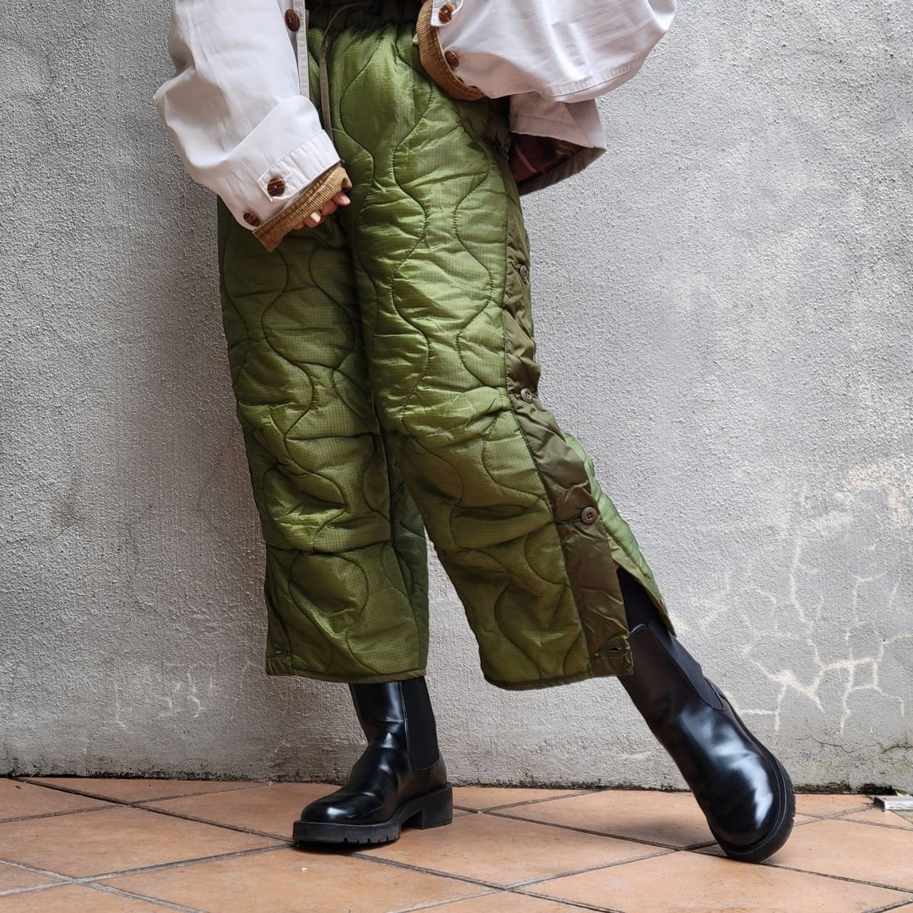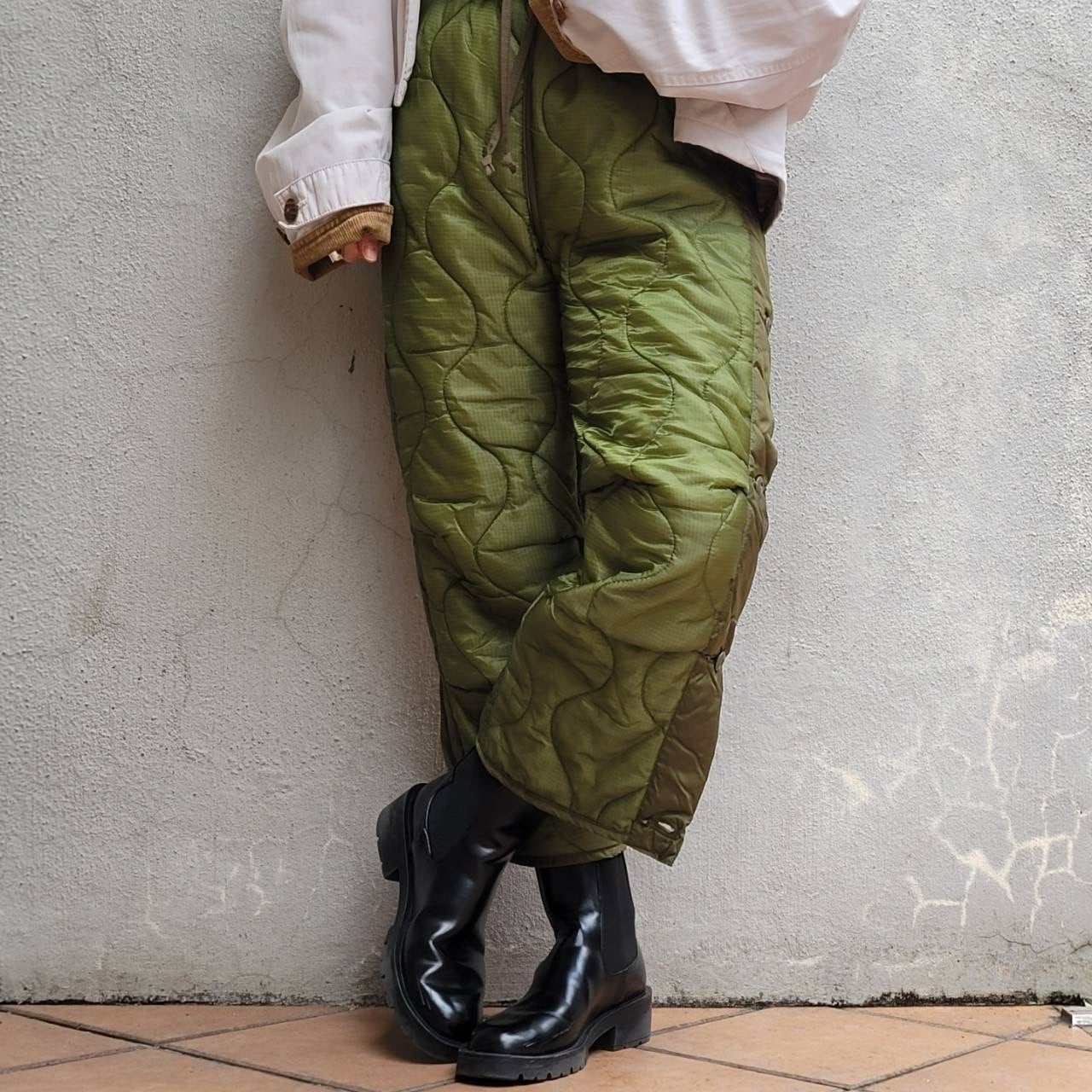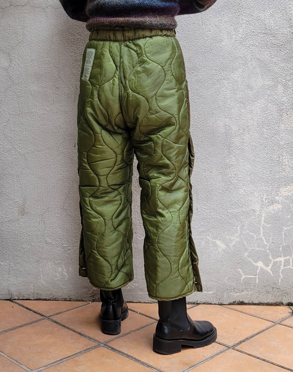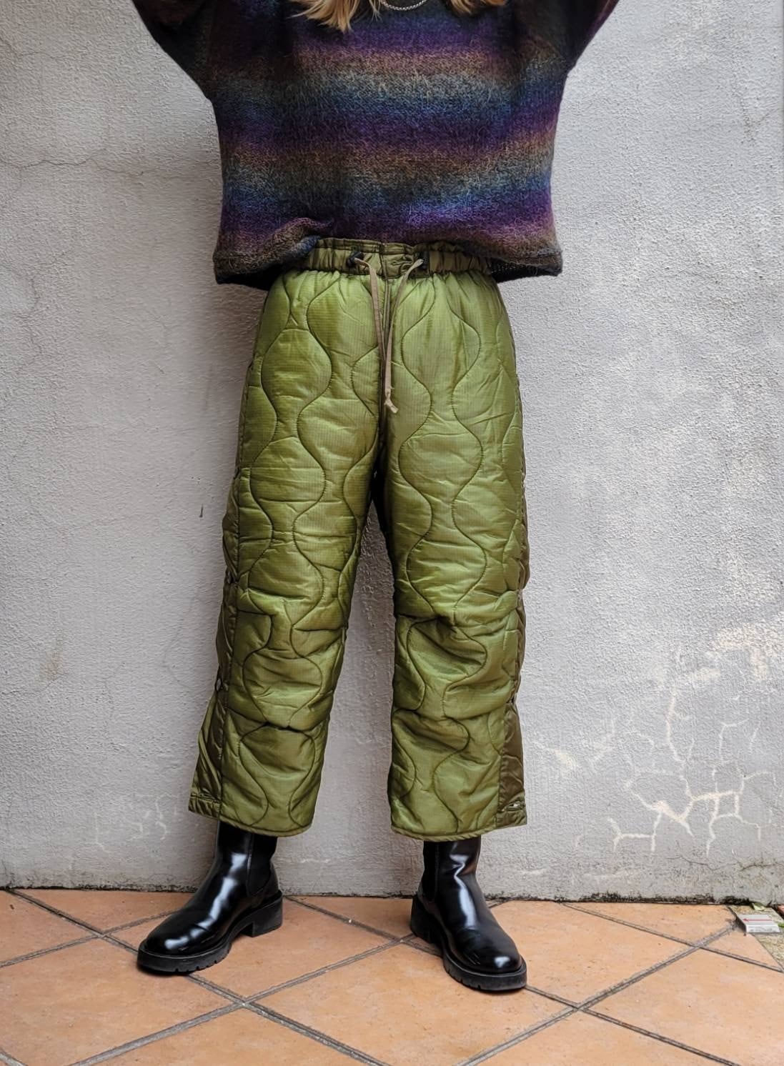 オーバーサイズミリタリーキルティングパンツのウエストをゴム&ドローコードにリメイクしました