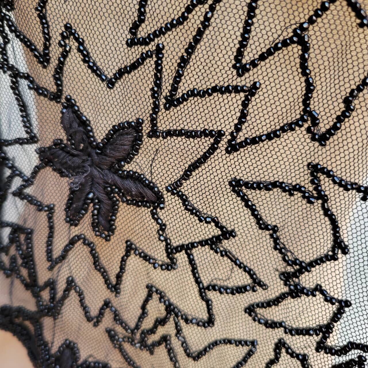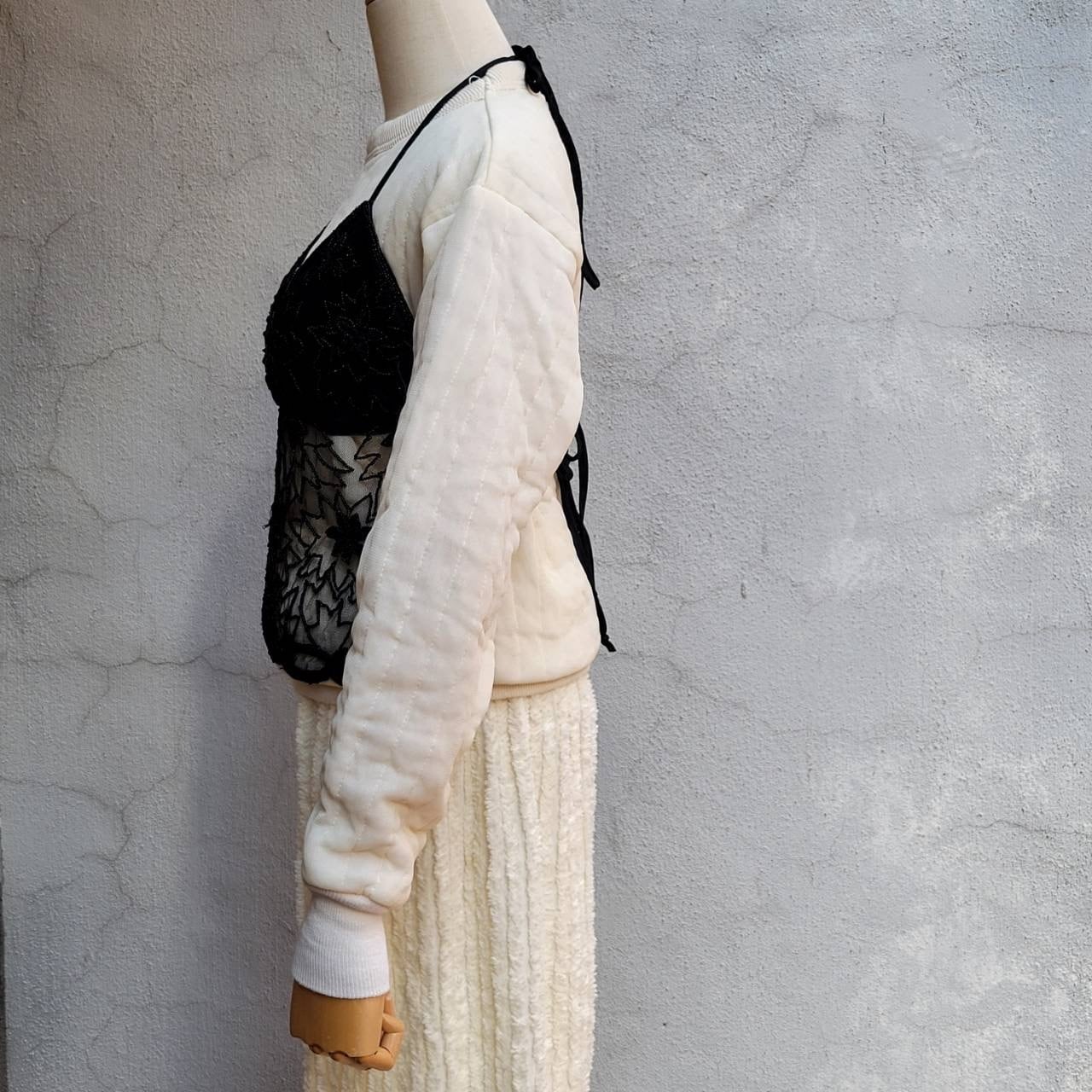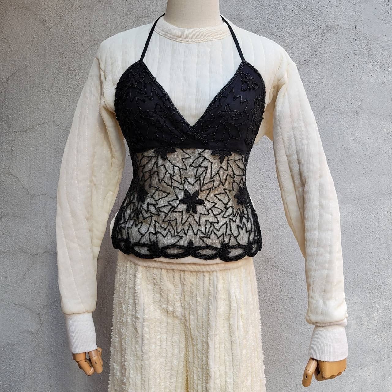 メッシュ素材の上にフラワーモチーフのビーズが施されています