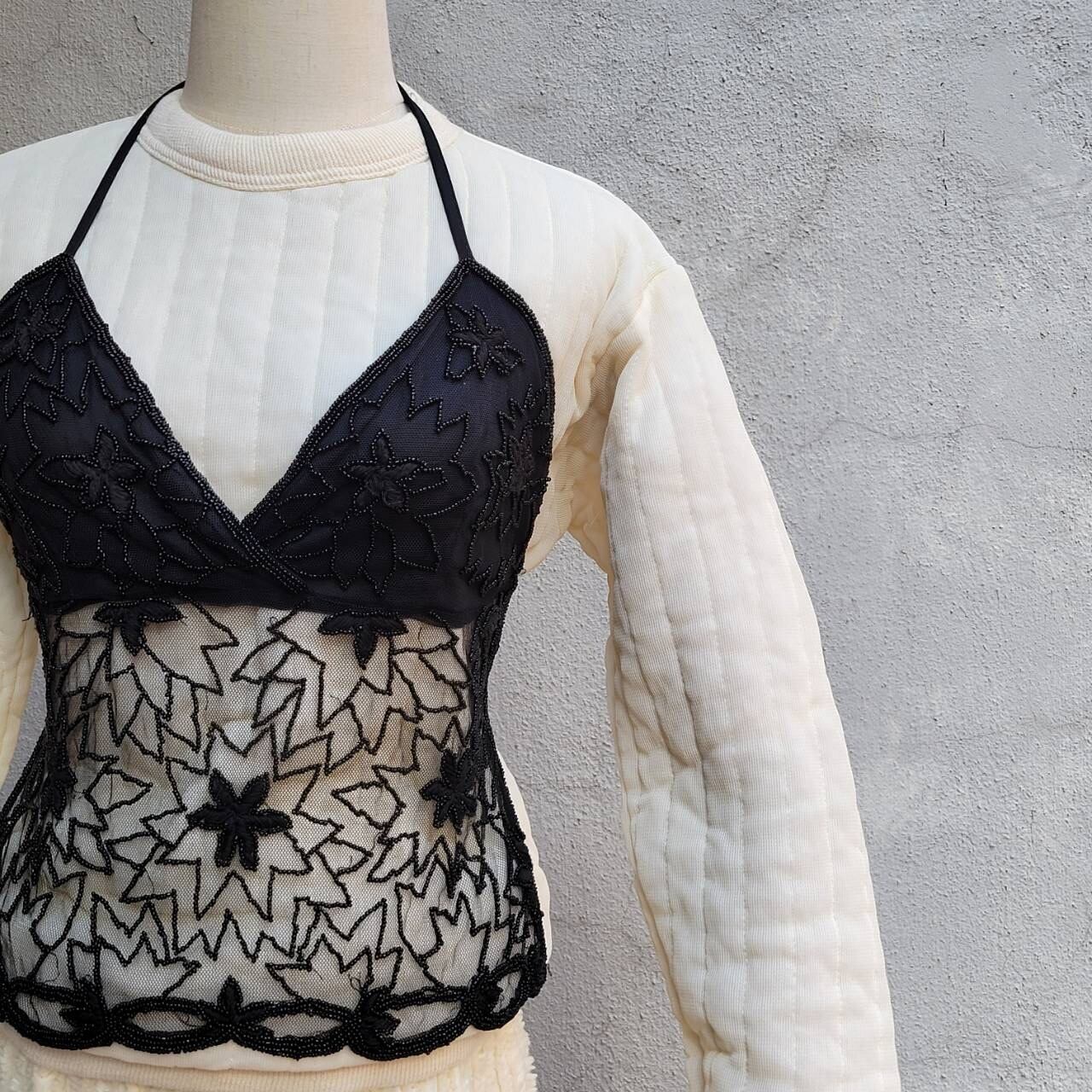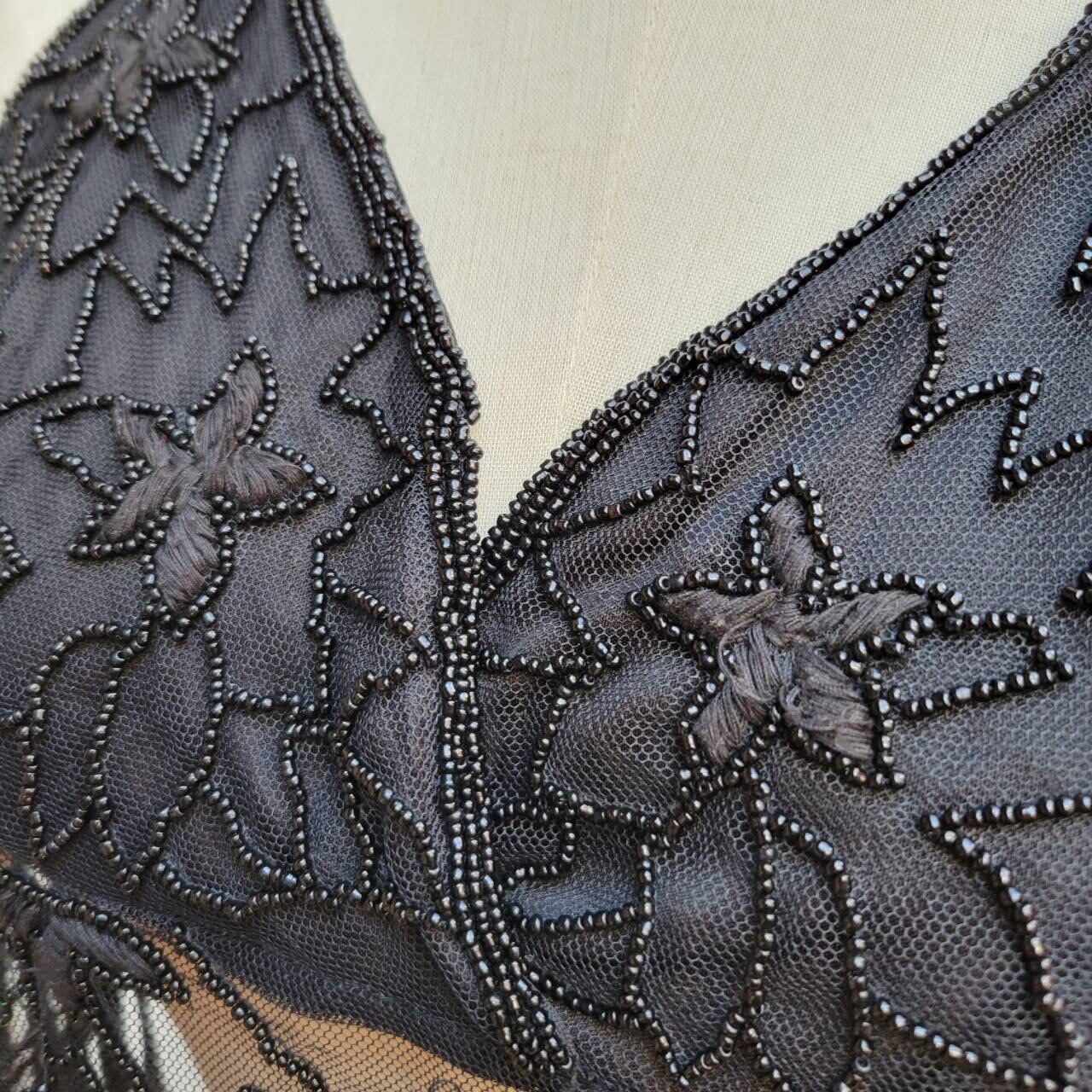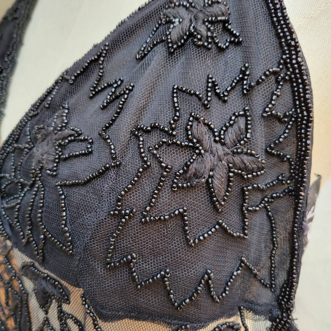 メッシュ素材の上にフラワーモチーフのビーズが施されています