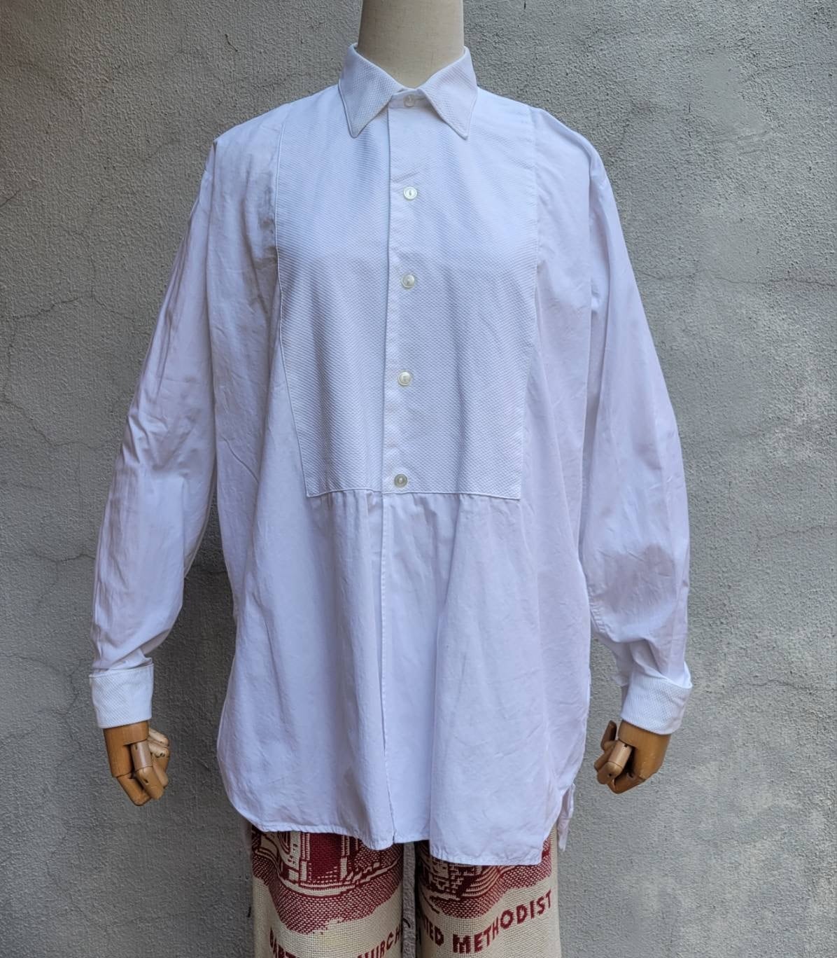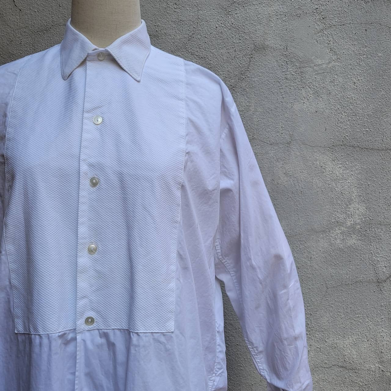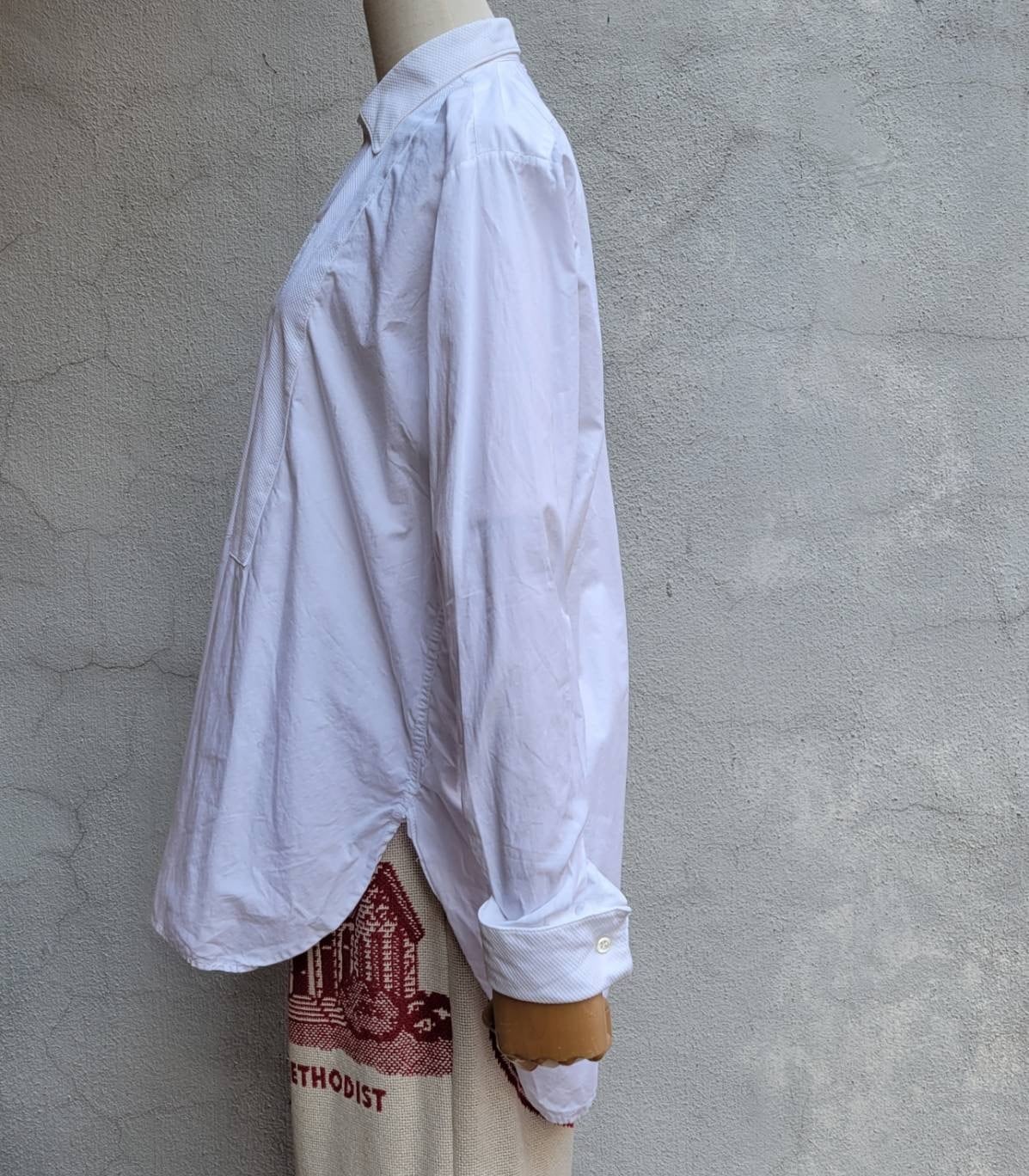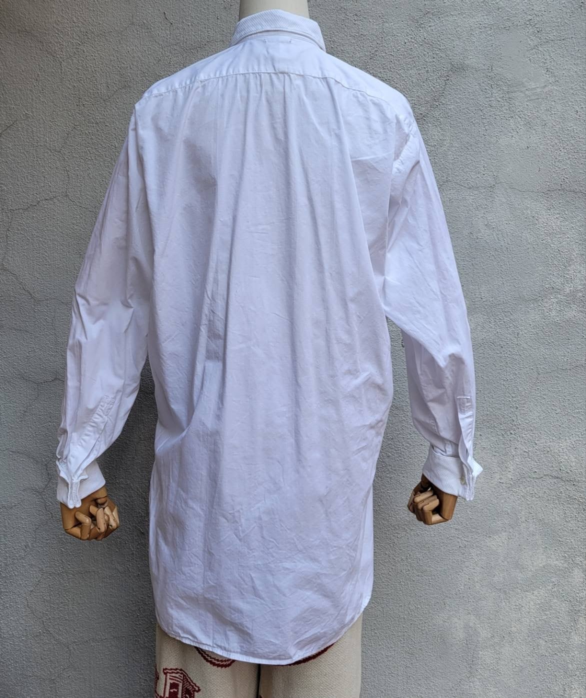 ゆったりした丈と襟&胸部分の切り替えが素敵なドレスシャツです