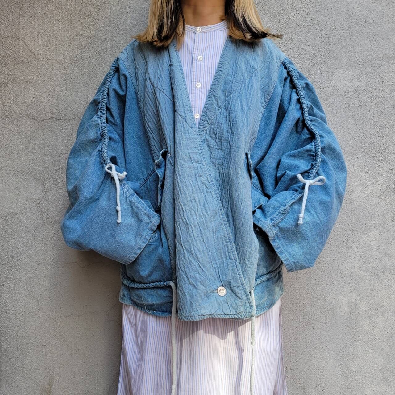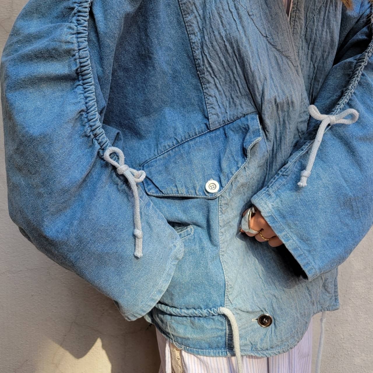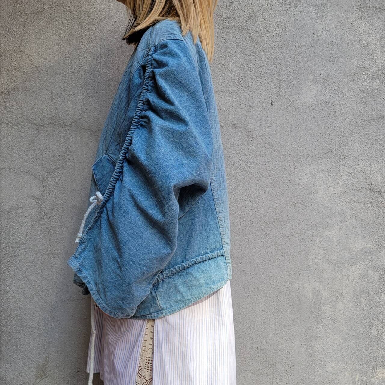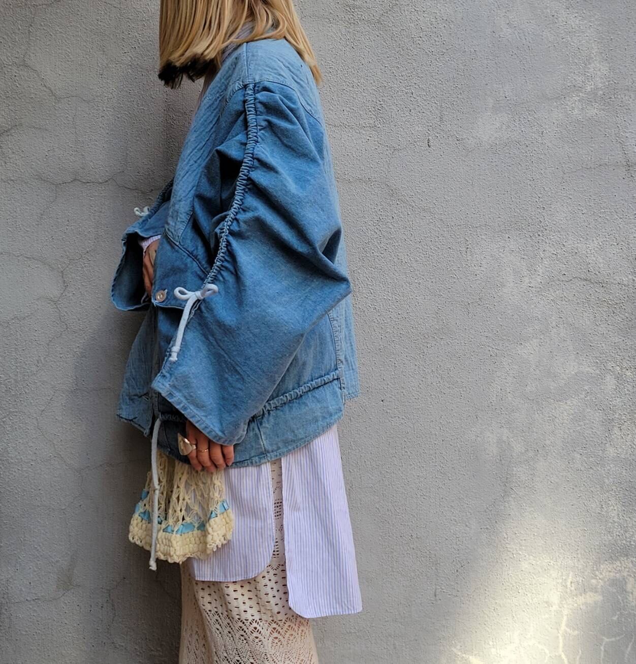 ドルマンスリーブ、ドロコード、切り替え、大きなポケットなどなどかわいい要素がたくさん詰まったデザインデニムジャケットです