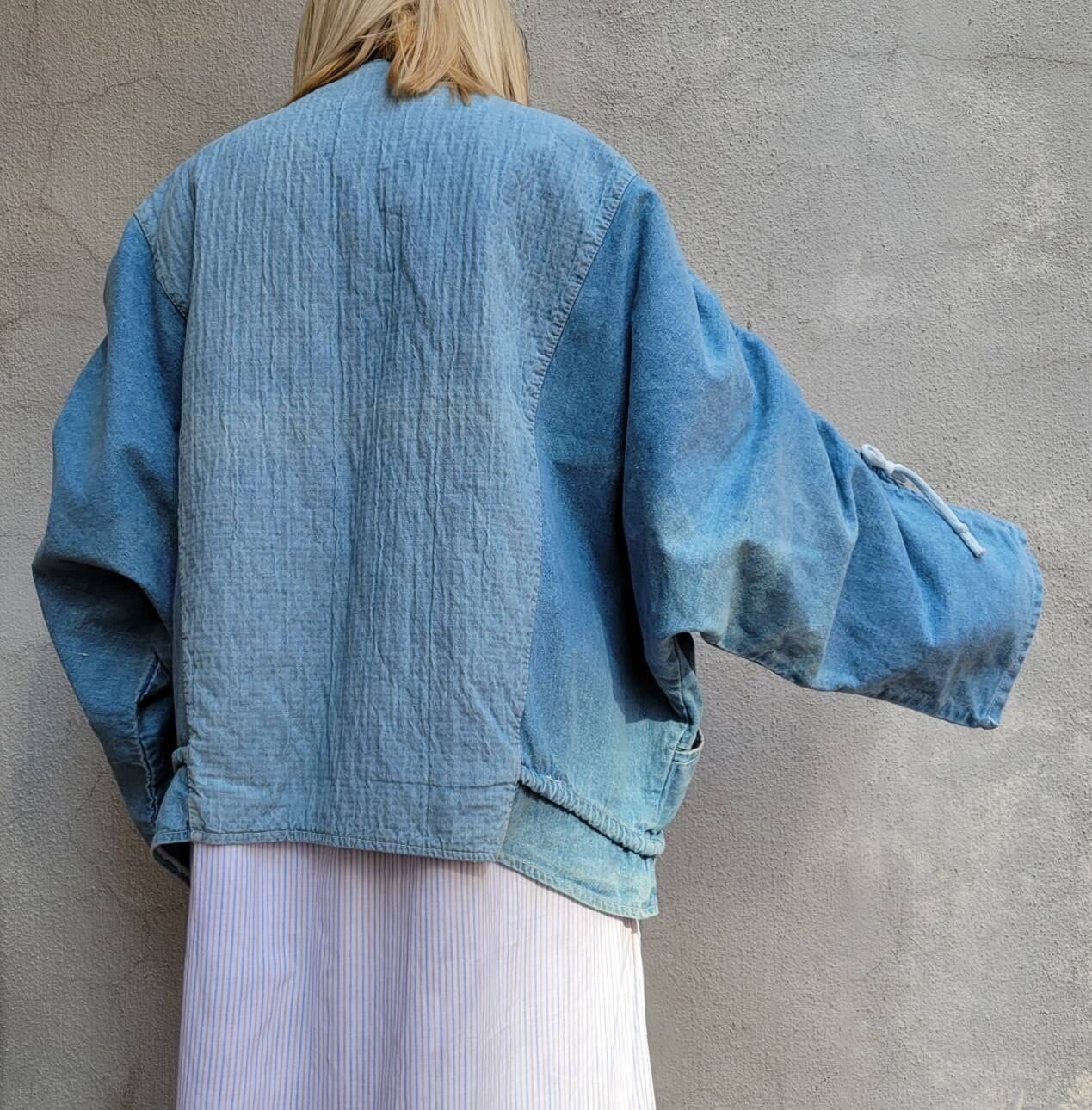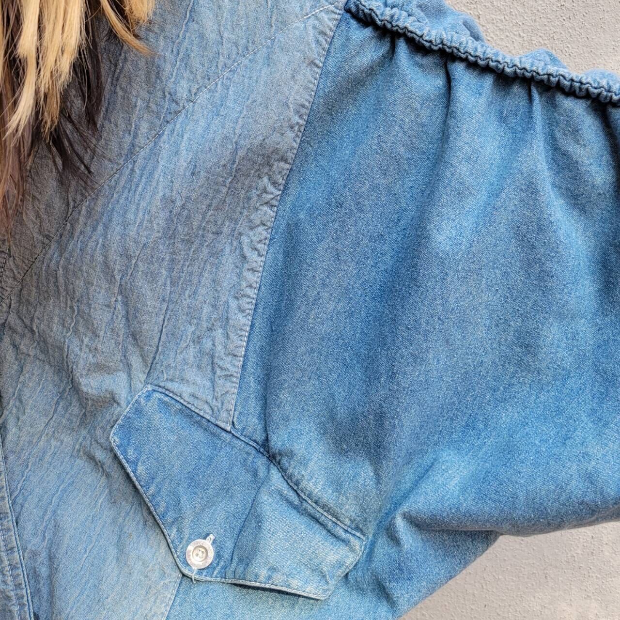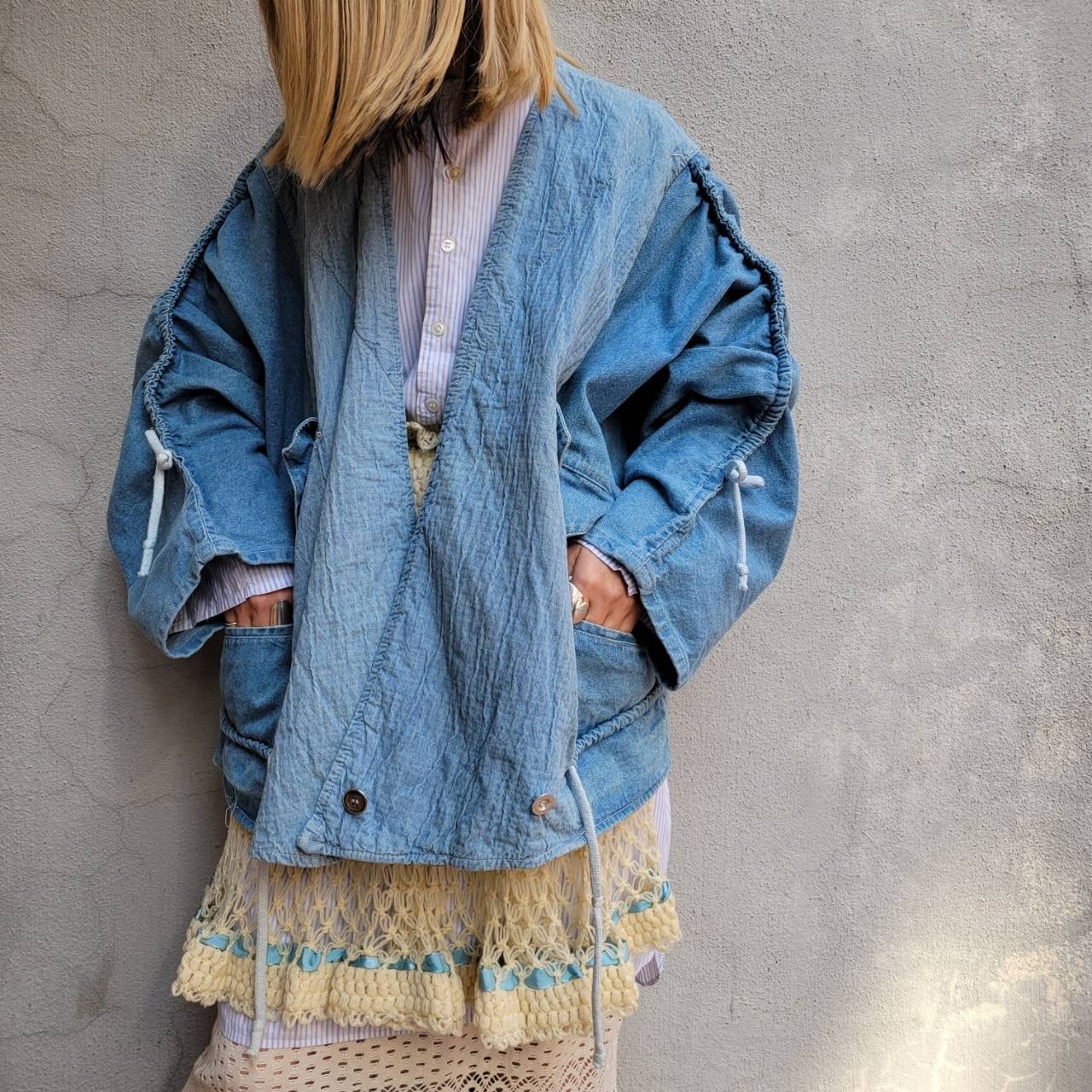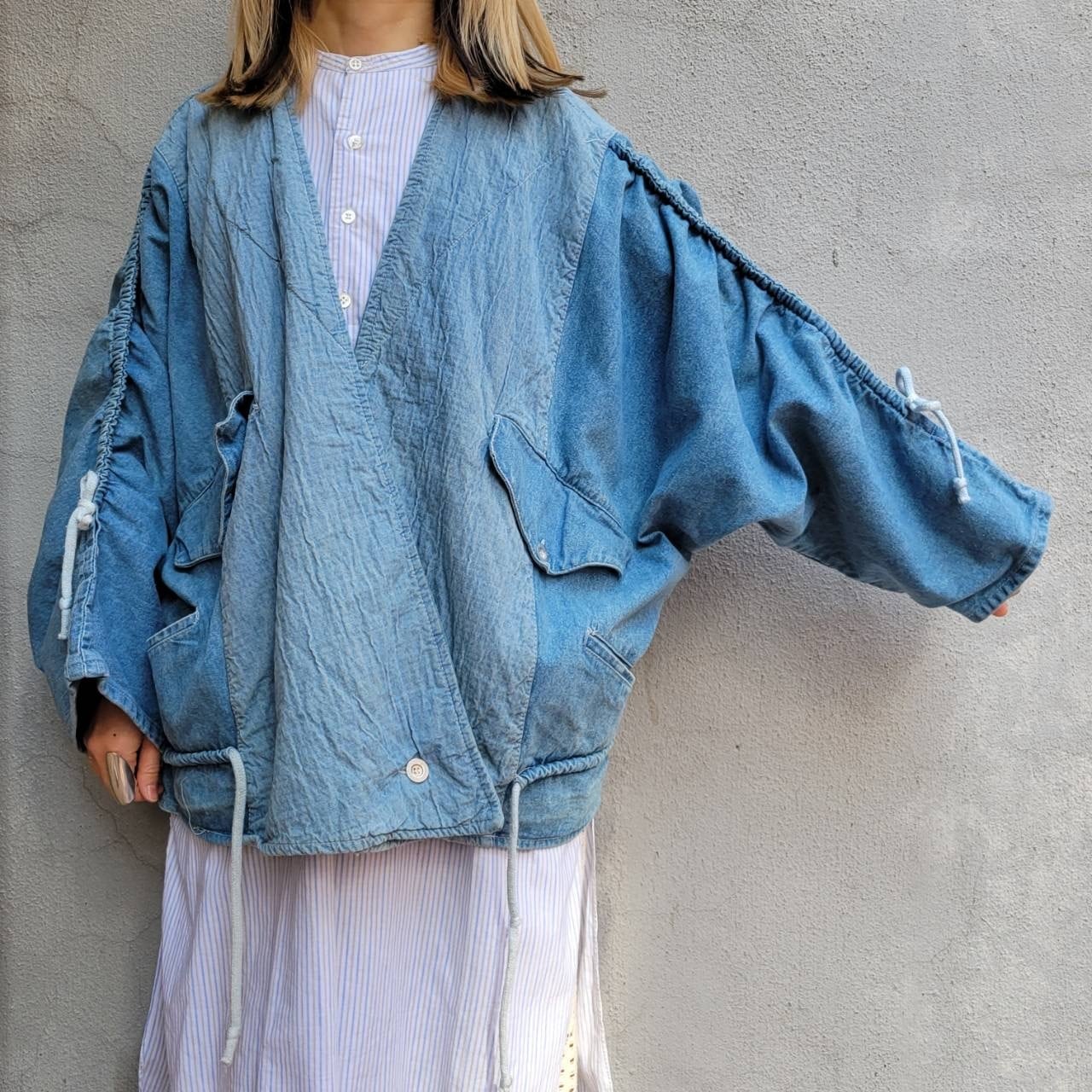 ドルマンスリーブ、ドロコード、切り替え、大きなポケットなどなどかわいい要素がたくさん詰まったデザインデニムジャケットです