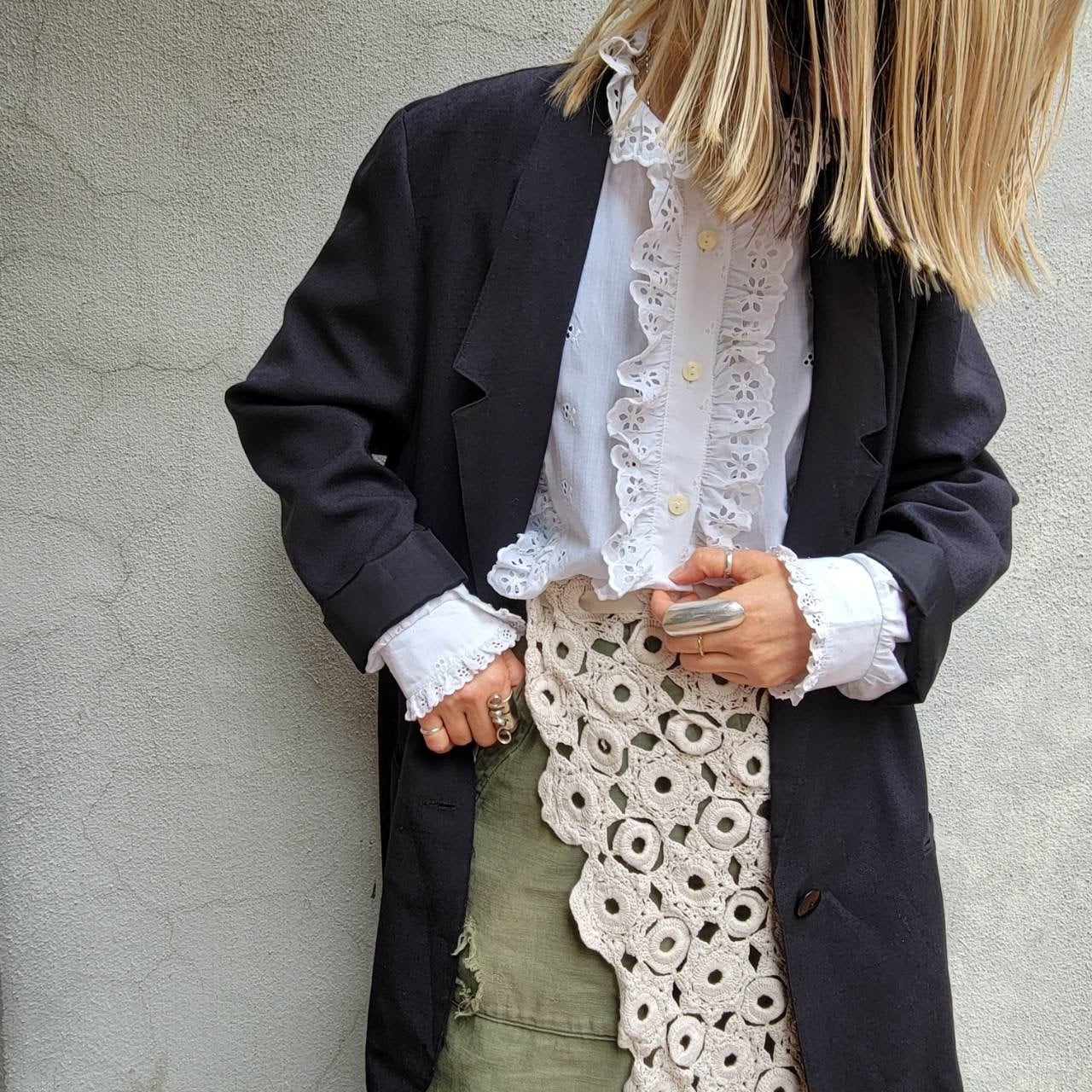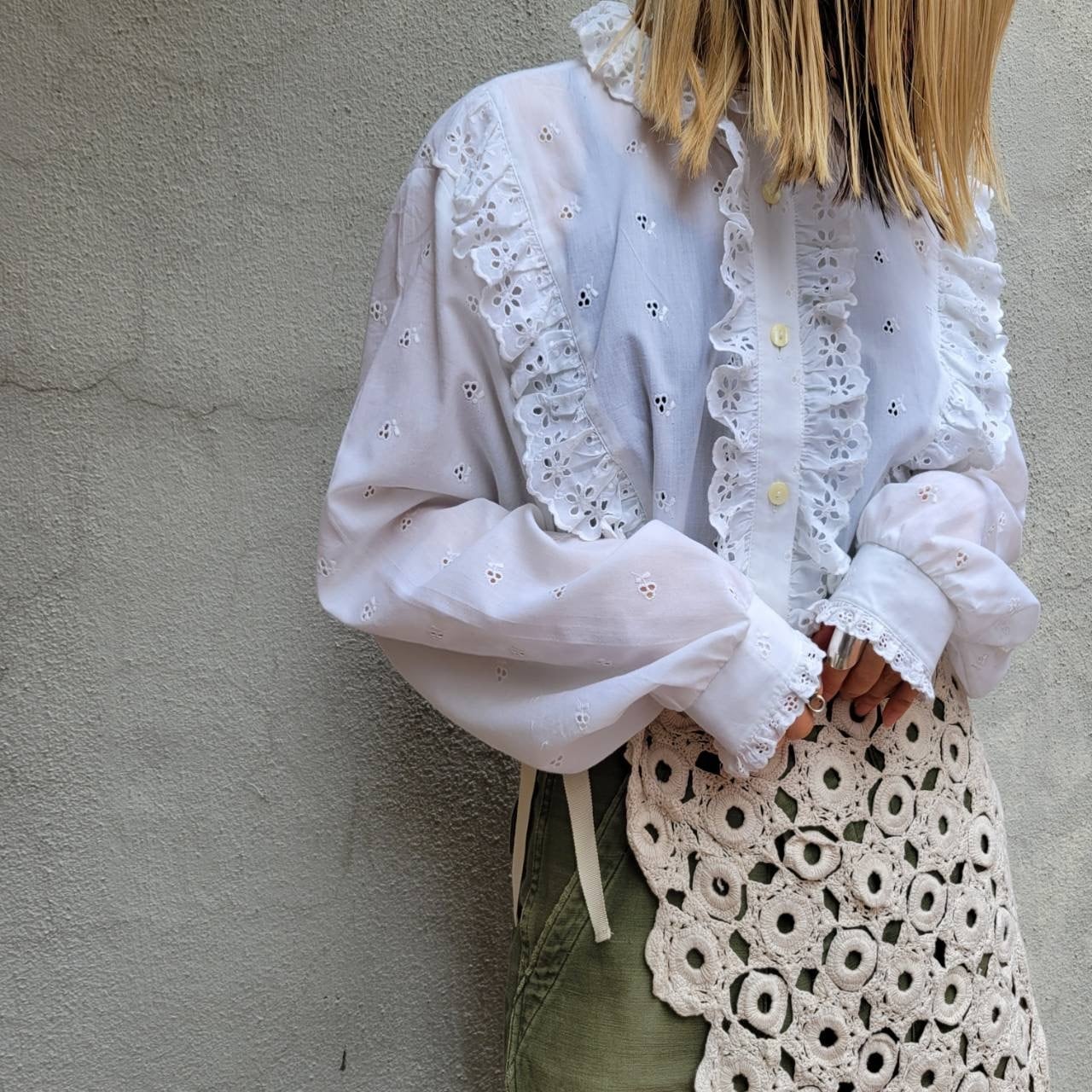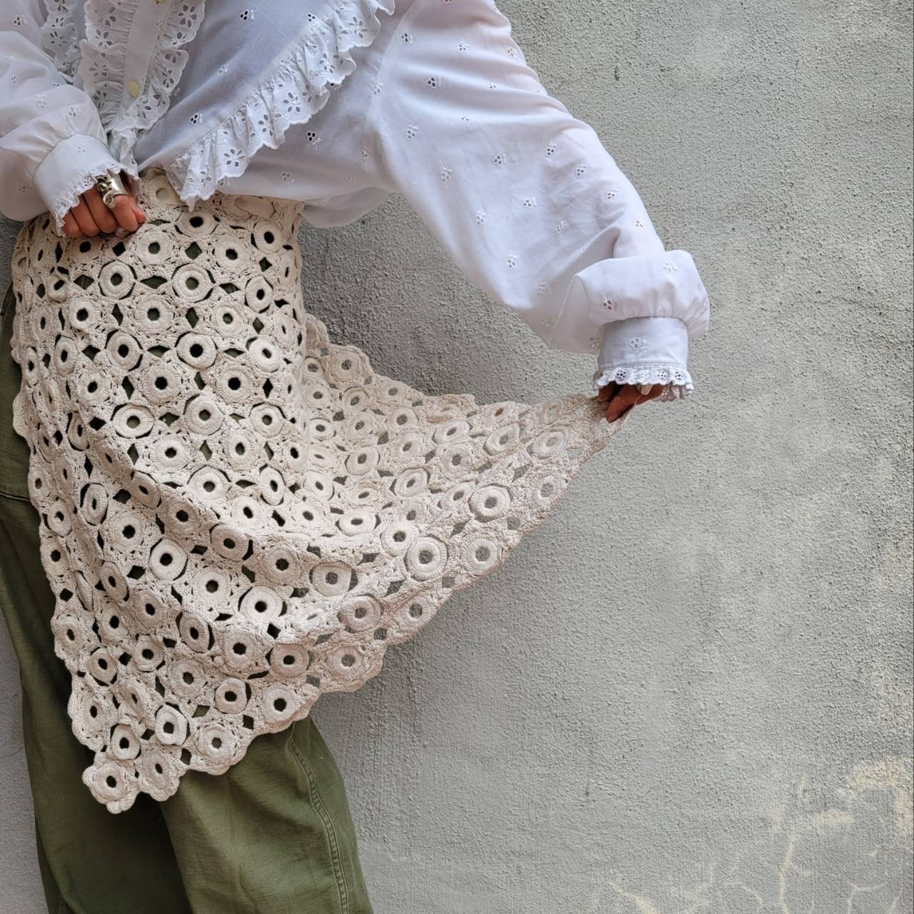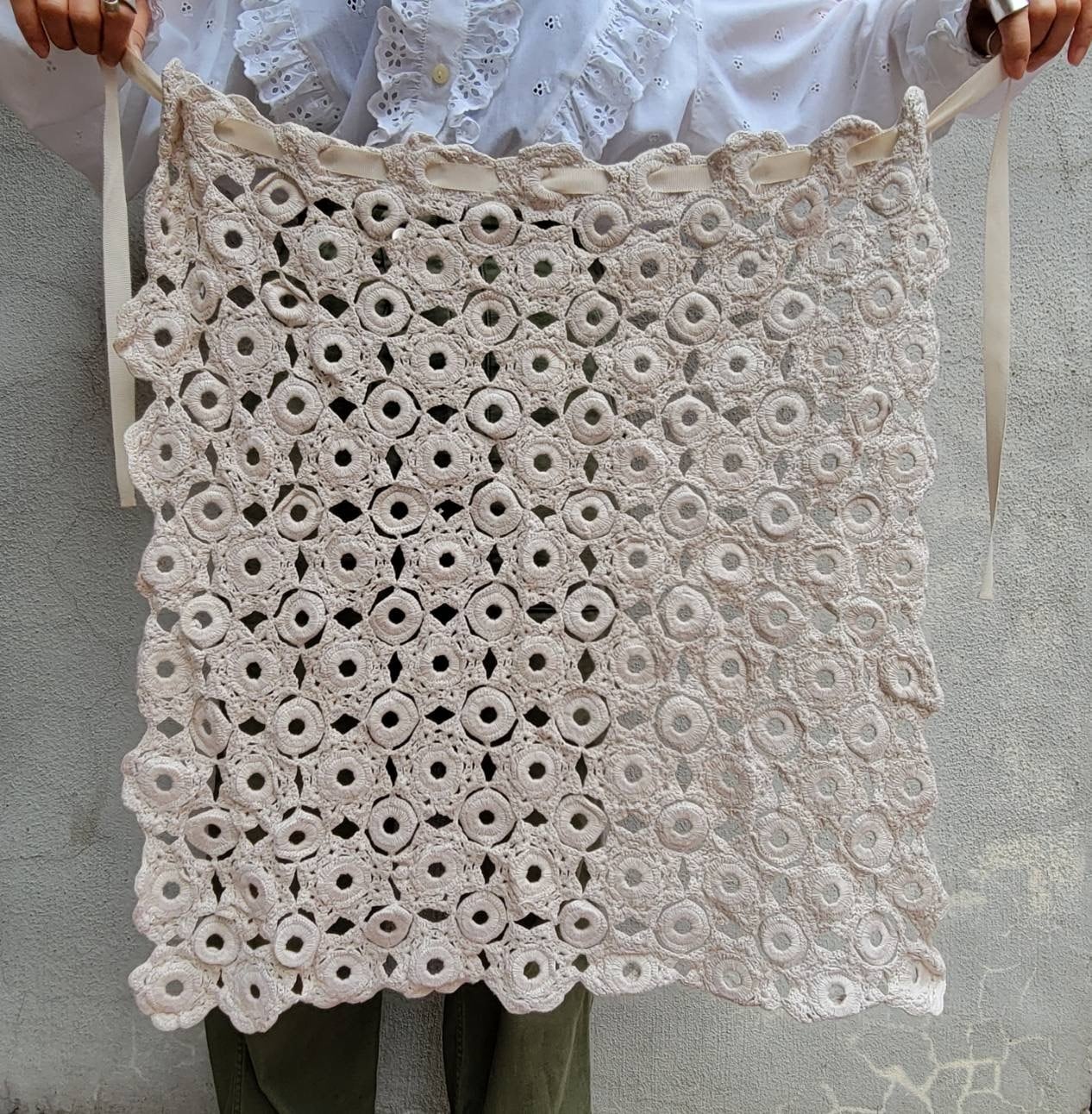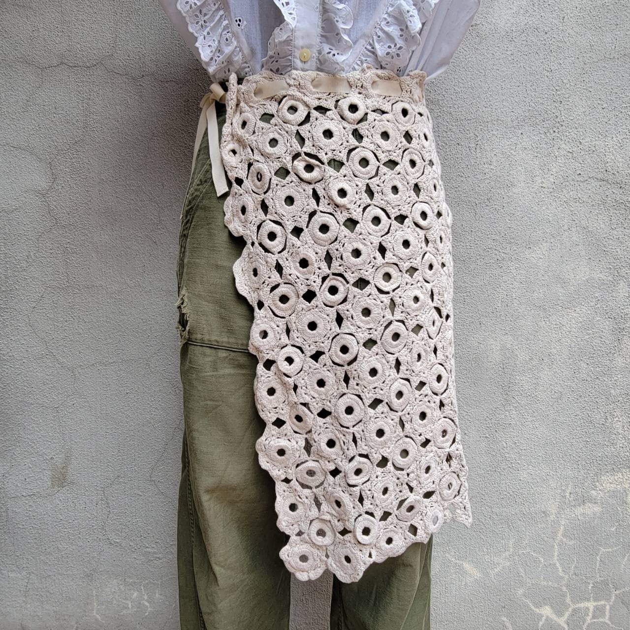 ヴィンテージクロシェレースにリボンをつけてエプロンのように巻けるようにしました