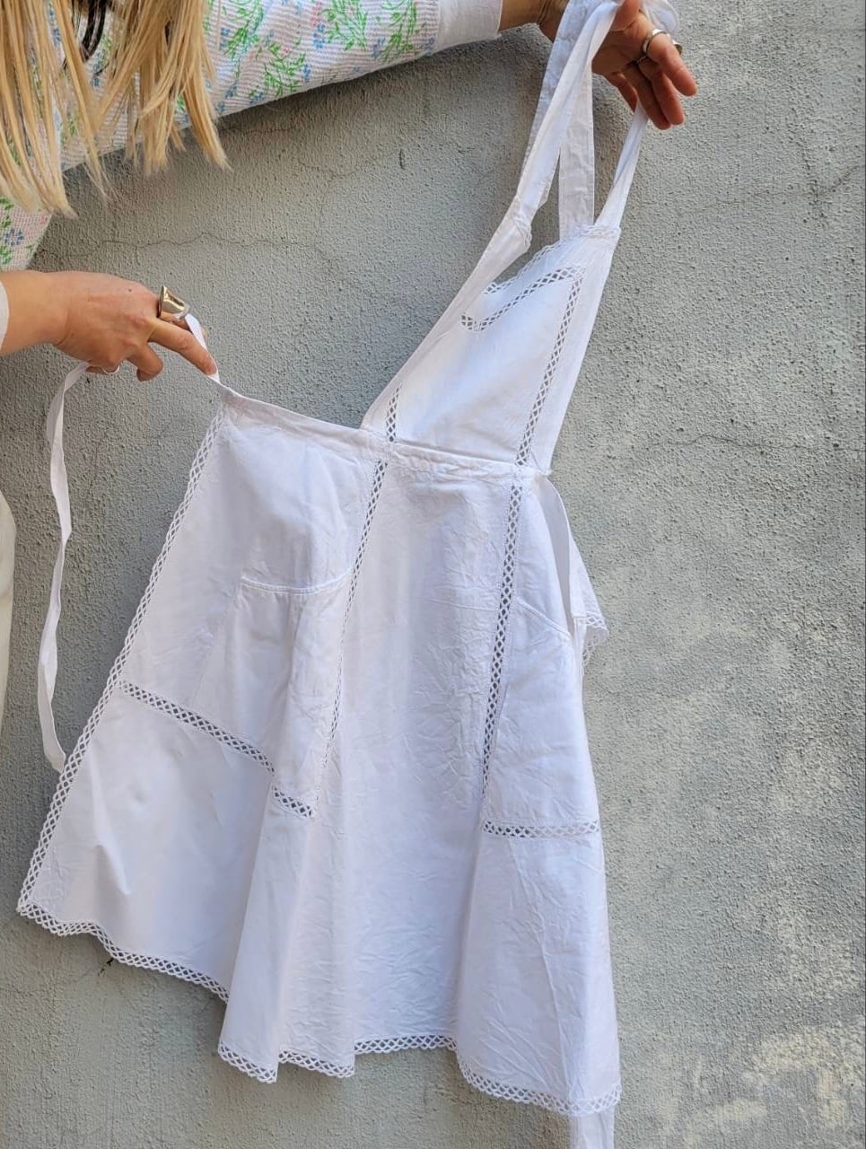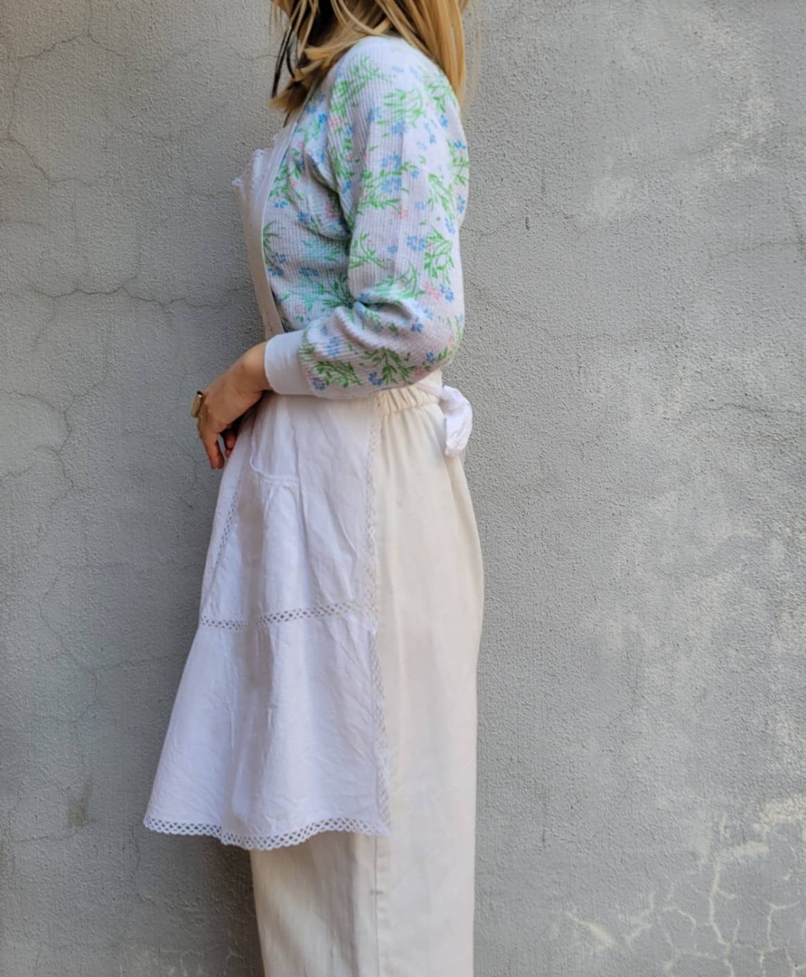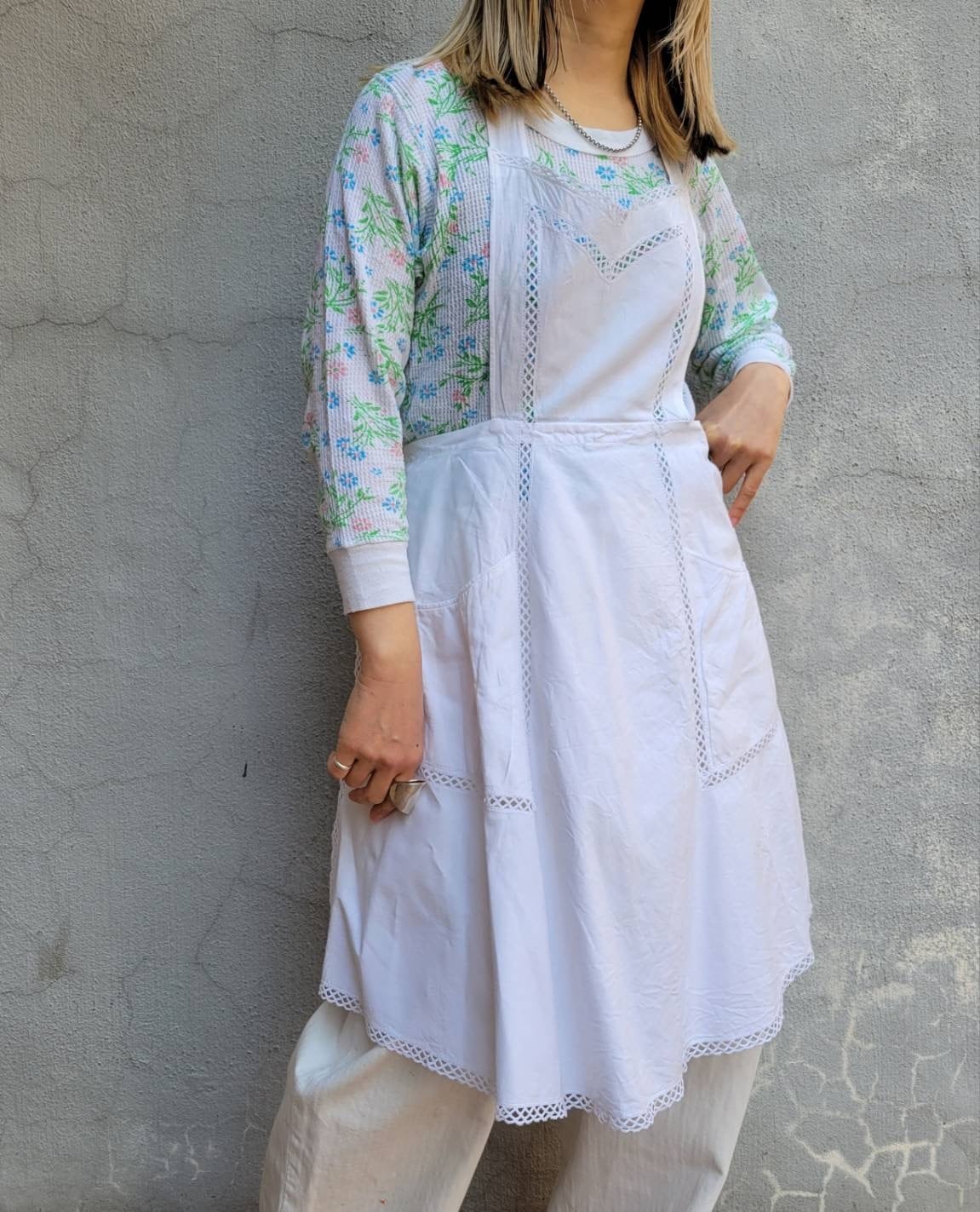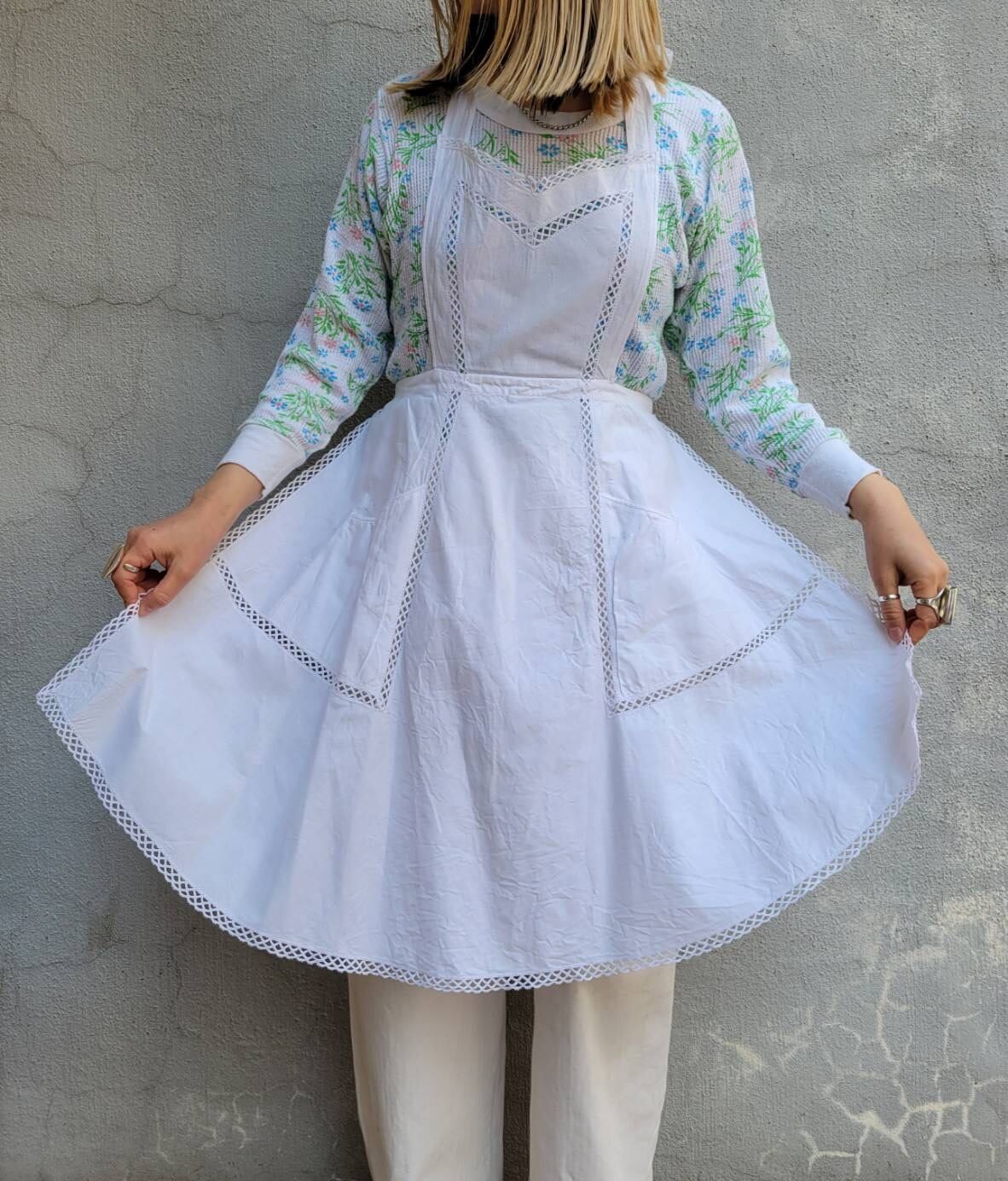 レースの切り替えとハリのある素材感が特徴的なエプロンになります