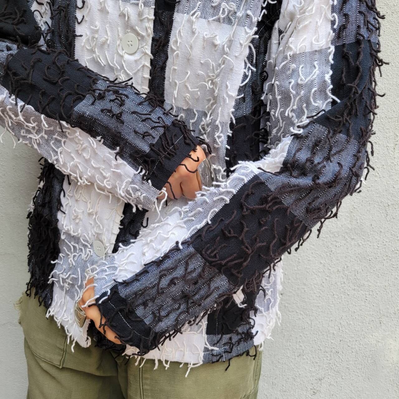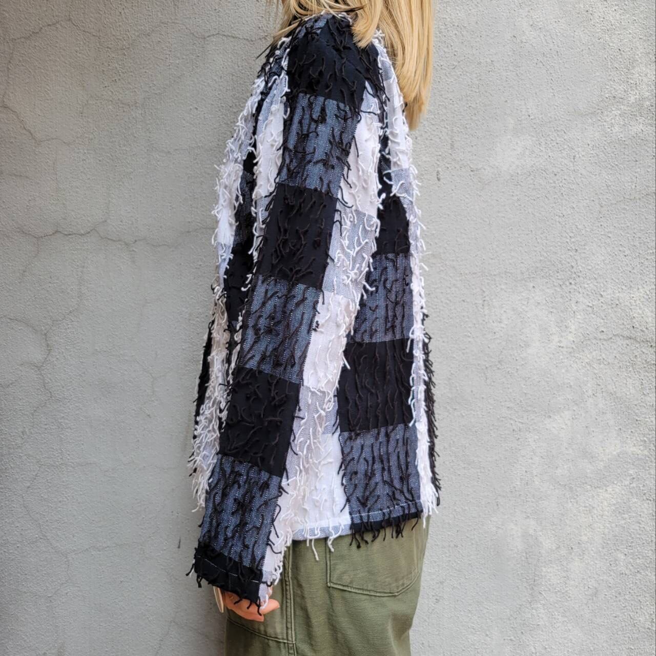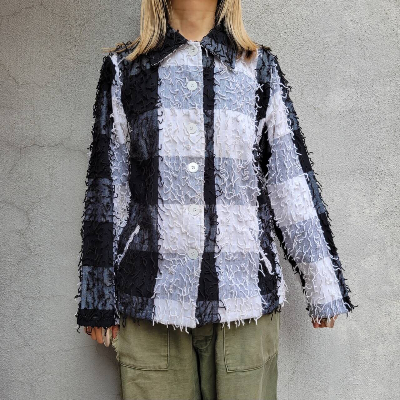 大きなチェック柄と細かいフリンジが特徴的なジャケットです