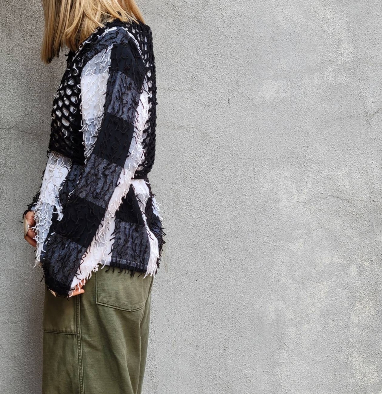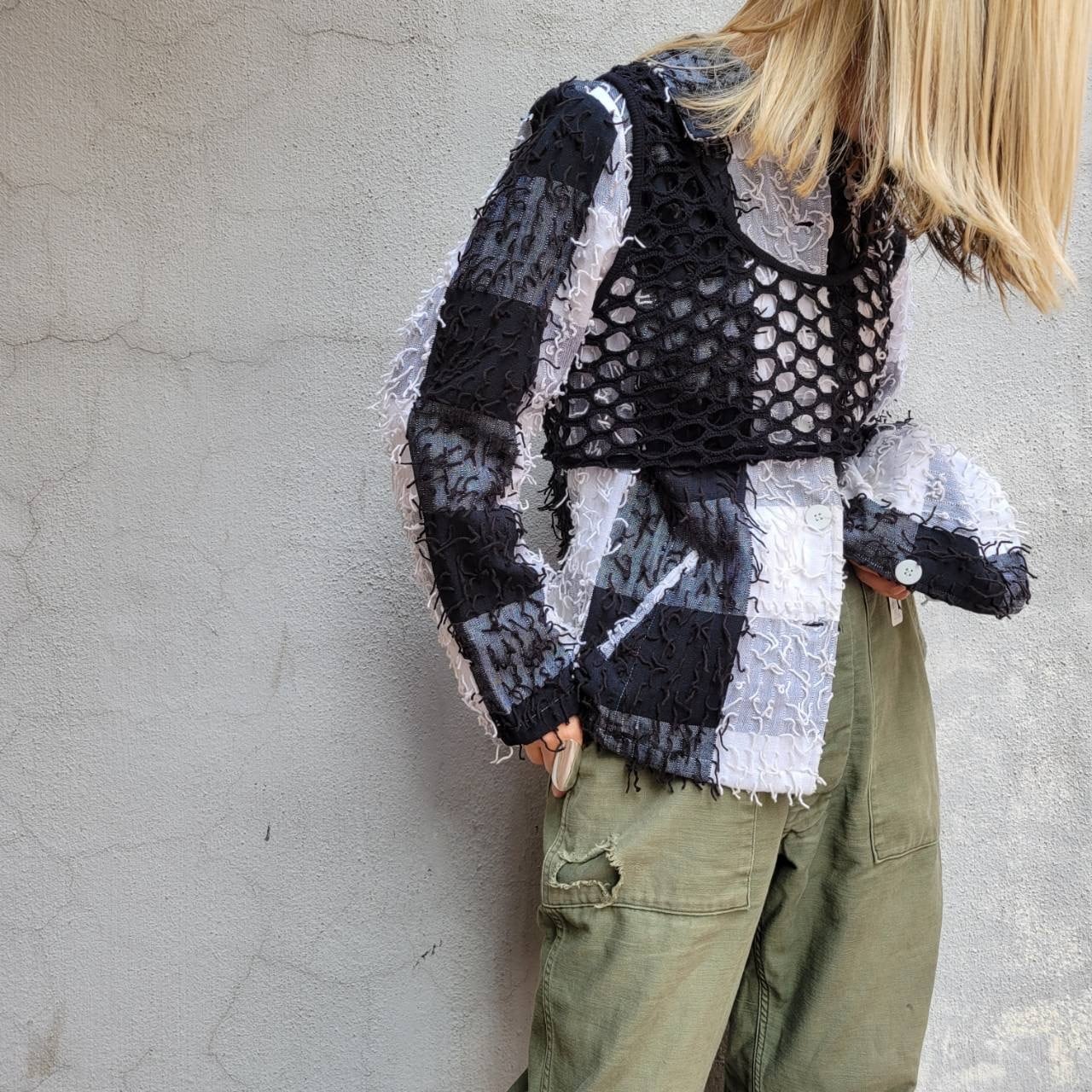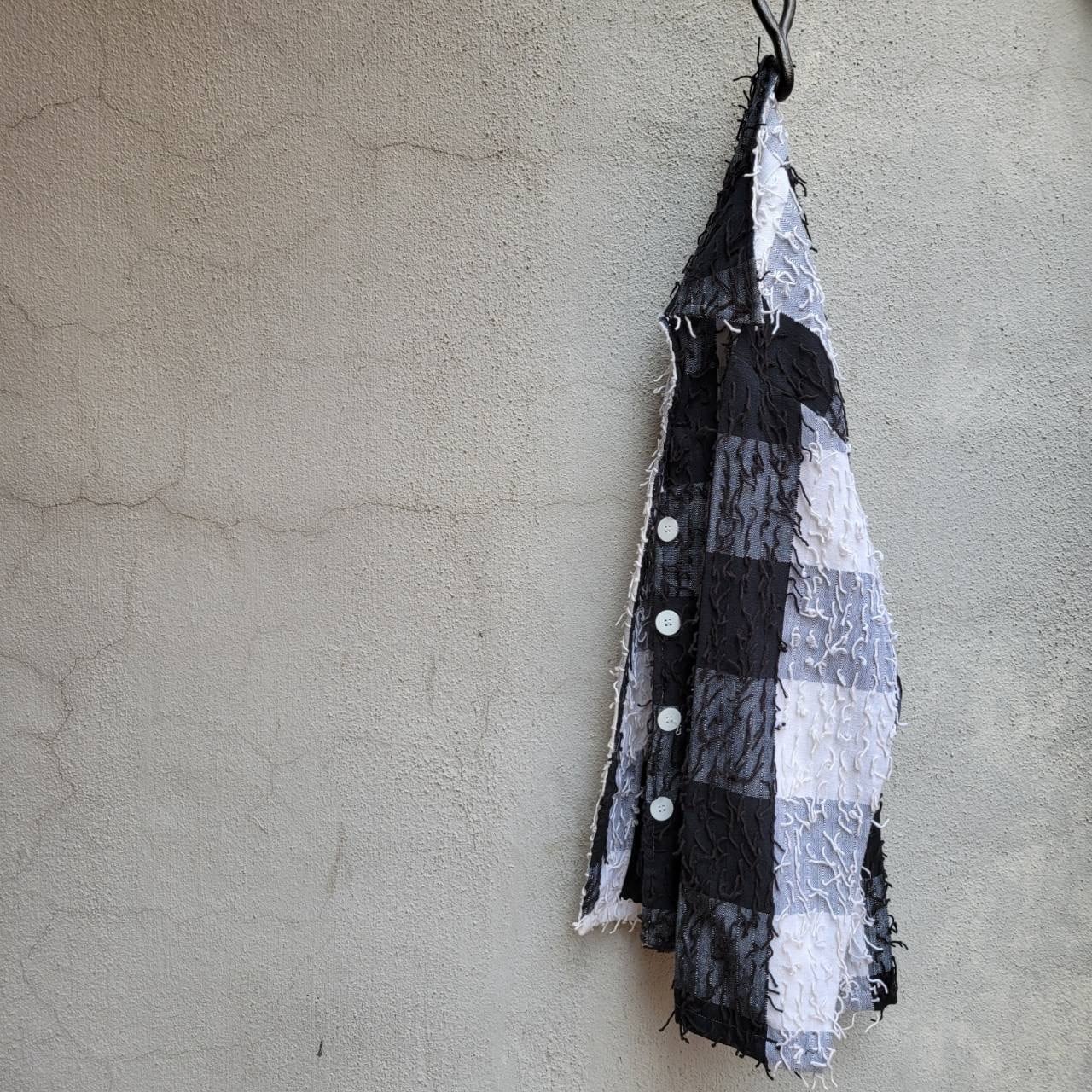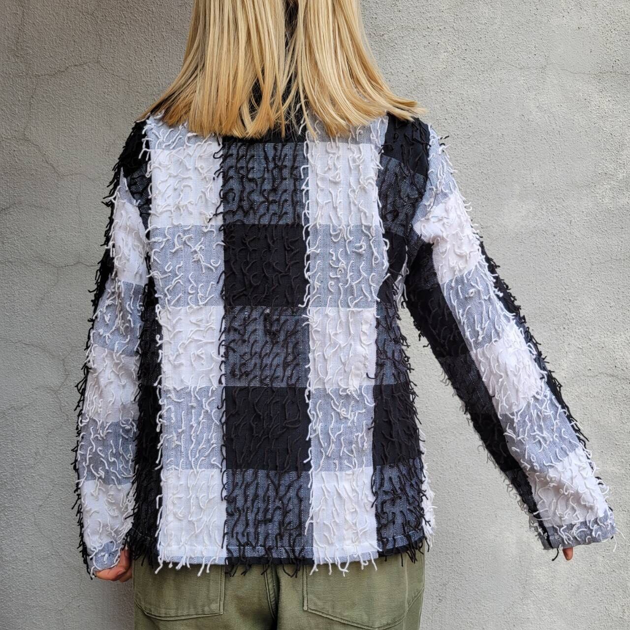 大きなチェック柄と細かいフリンジが特徴的なジャケットです
