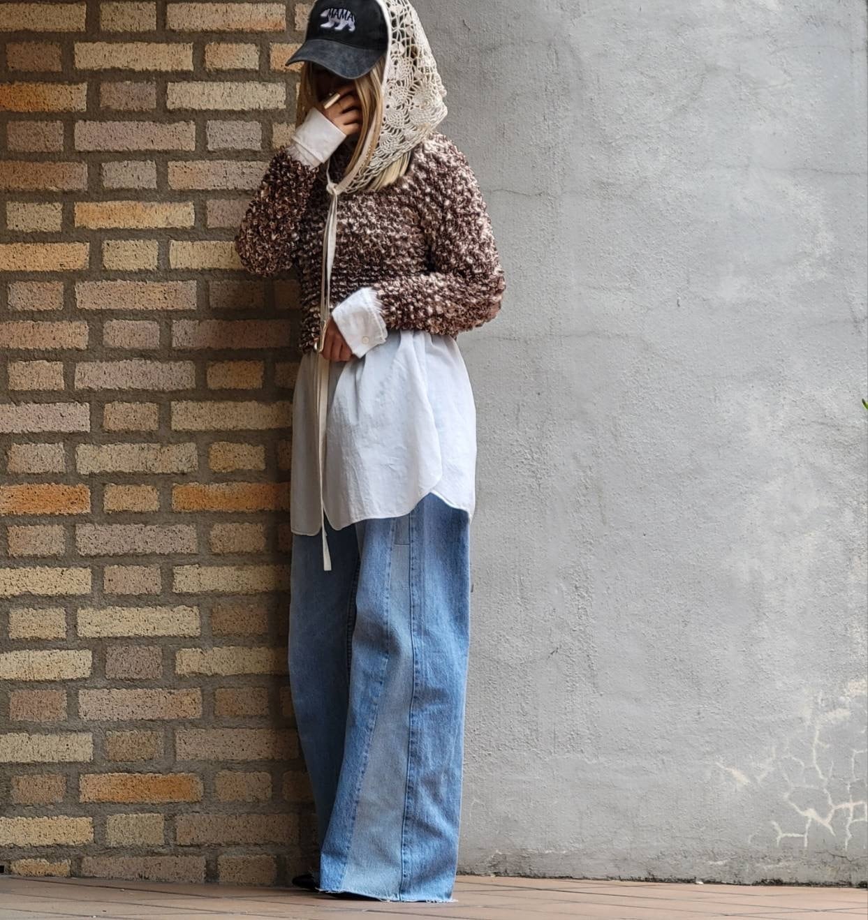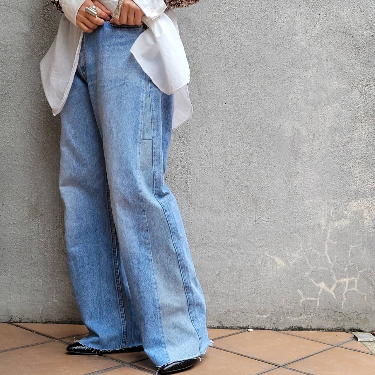 パッチワークデニムをサイドに入れてワイドシルエットになっています