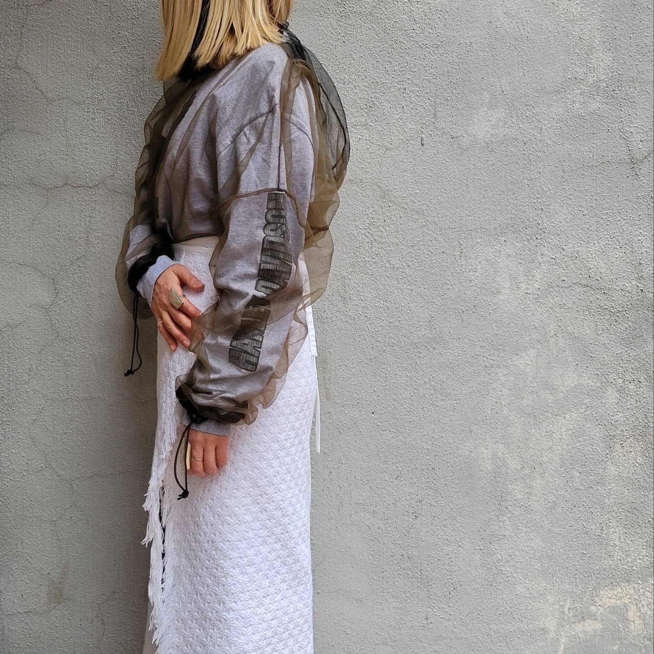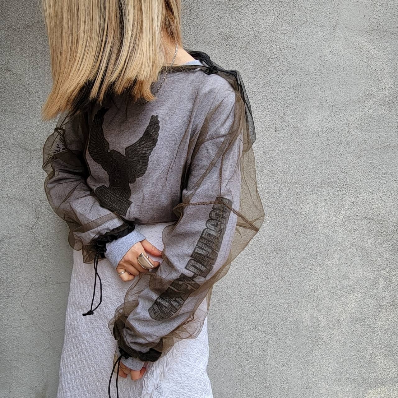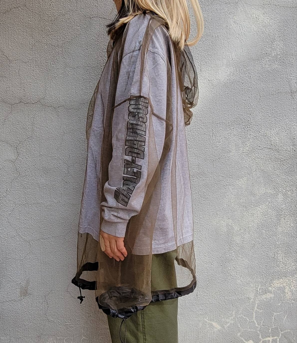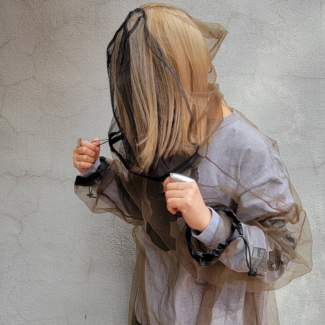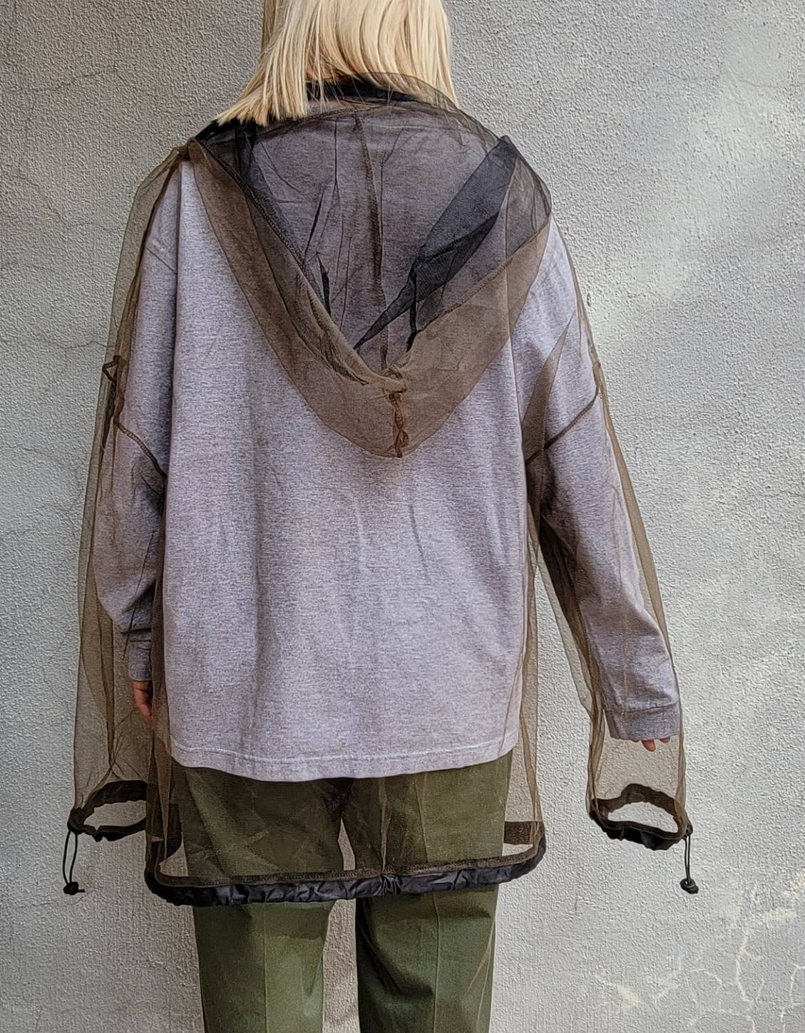 オーバーサイズ、袖口と裾部分にドローコード・フード部分はファスナーで頭部全体を覆えるデザインになっています