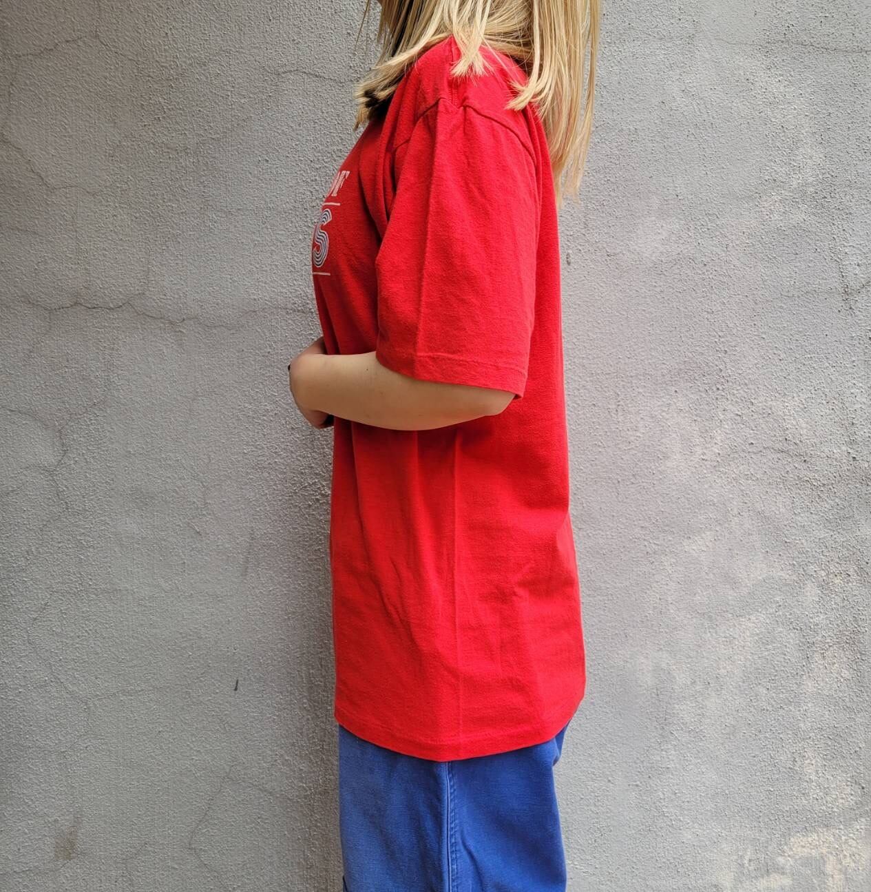 かすれたロゴと朱赤よりの赤色が特徴的なtシャツです