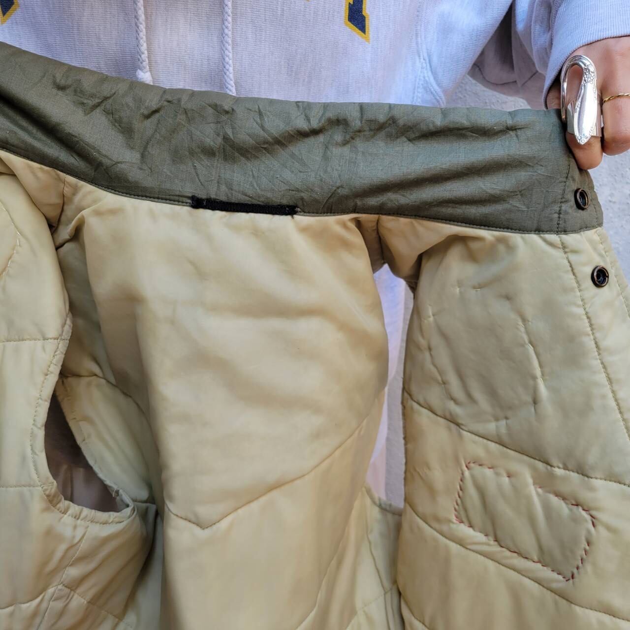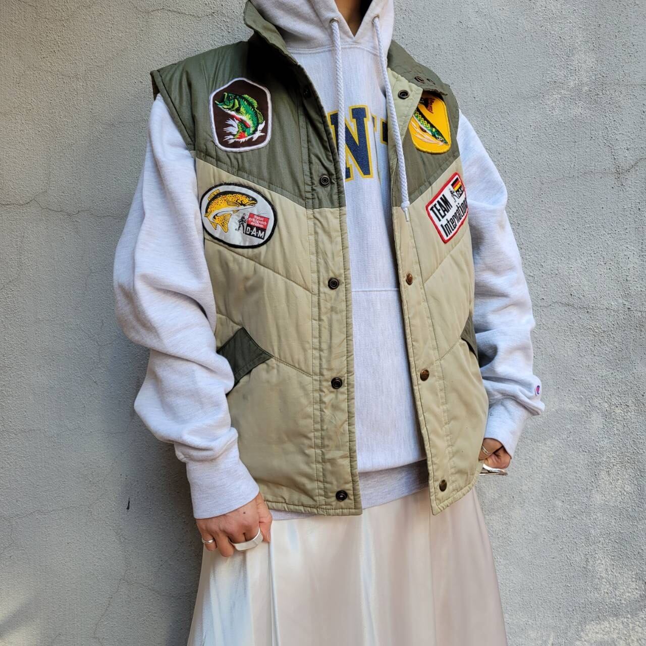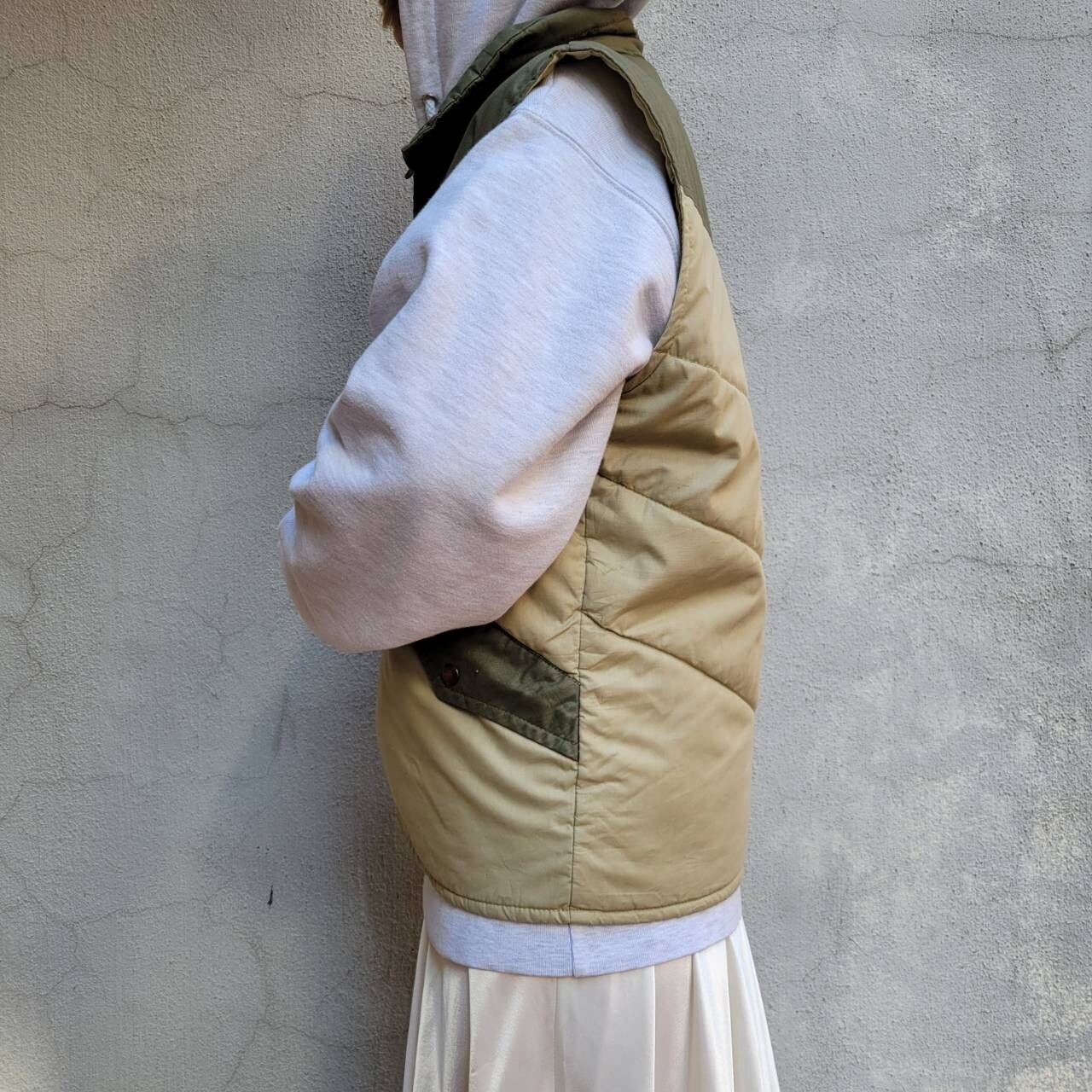 ツートンカラーとワッペンが可愛い軽めの中綿ベストです